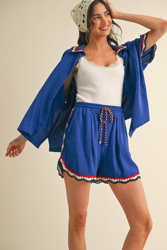 Blue Crochet Trimmed Linen Shirt & Short Set
