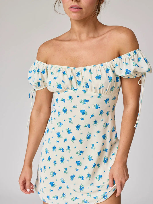 Cream & Royal Blue Floral Square Neck Ruffle Sleeve Mini Dress