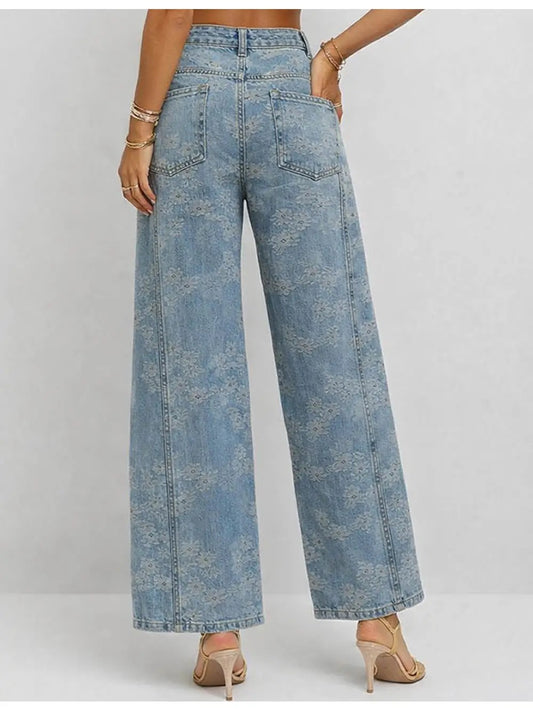 Floral Denim Jacquard Button Wide Leg Jeans