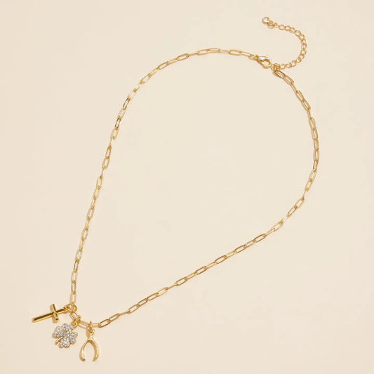Gold Dipped Charm Necklace with Cross, Clover, Wishbone