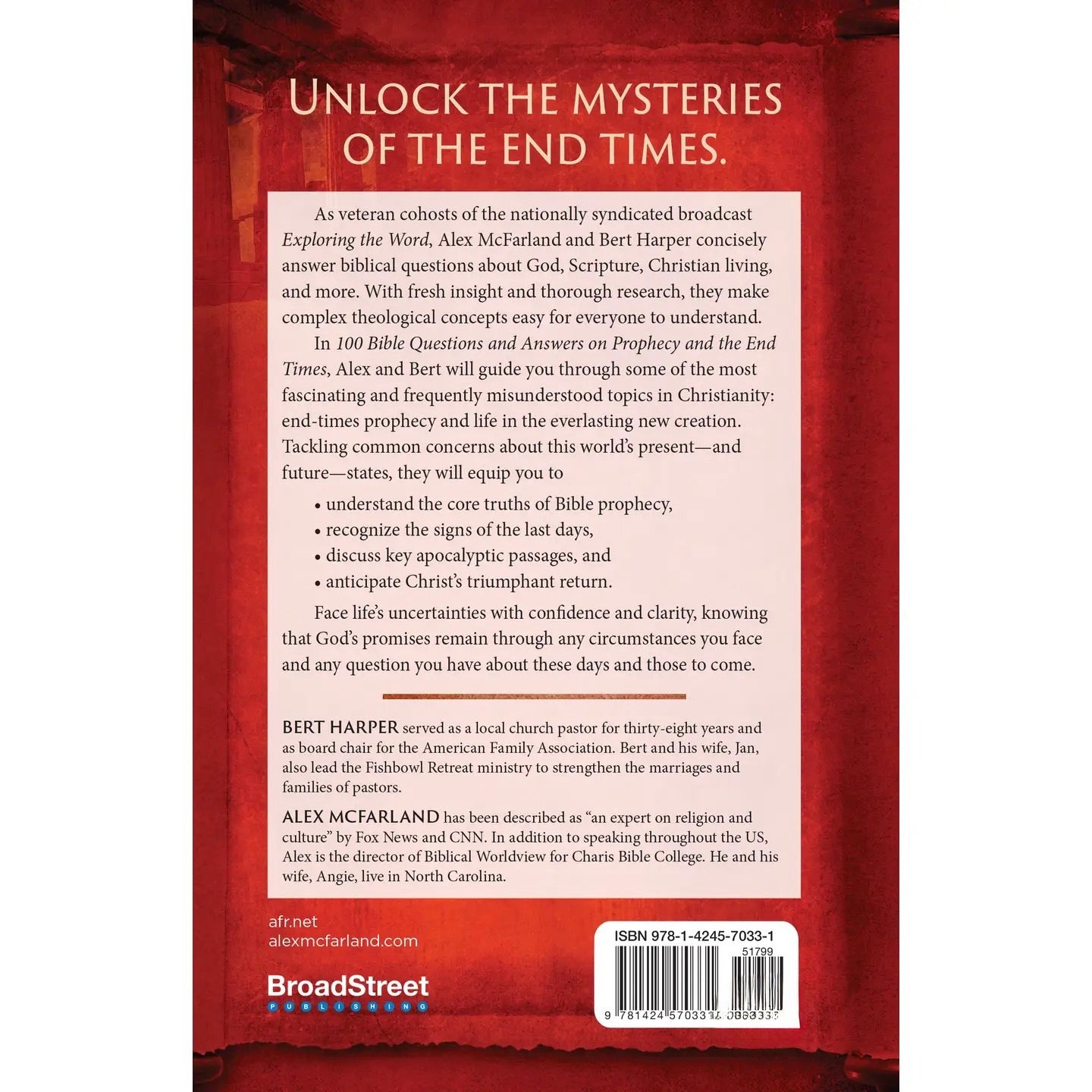 n 100 Bible Questions and Answers on Prophecy and the End Times, Alex and Bert will guide you through some of the most fascinating and frequently misunderstood topics in Christianity: end-times prophecy and life in the everlasting new creation. Tackling common concerns about this world’s present— and future—states, they will equip you to: • understand the core truths of Bible prophecy, • recognize the signs of the last days, • discuss key apocalyptic passages, and • anticipate Christ’s triumphant return. Face life’s uncertainties with confidence and clarity, knowing that God’s promises remain through any circumstances you face and any question you have about these days and those to come. Features: Softcover, 224 pages