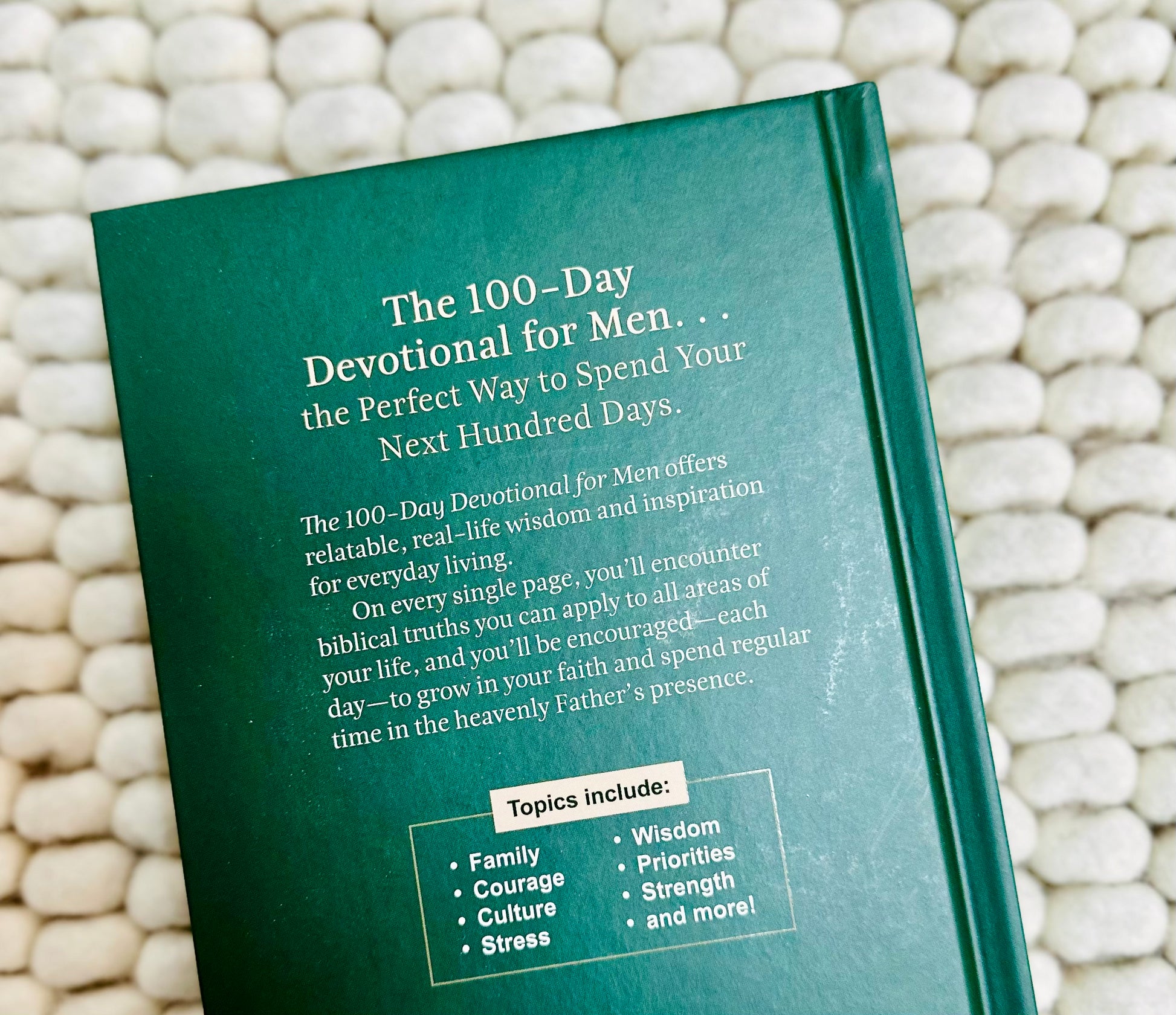 The Perfect Way to Spend the Next Hundred Days. . . The 100-Day Devotional for Men offers relatable, real-life wisdom and inspiration for everyday living. Men of all ages will encounter page after page of biblical truths they can apply to every area of their lives. With topics like Family, Courage, Culture, Stress, Wisdom, Priorities, Strength, and more, these devotions will encourage readers to grow in their faith and spend regular time in the heavenly Father's presence. Each devotional reading is complemented by a brief scripture selection and short prayer-starter. The 100-Day Devotional for Men is the perfect place for you to spend your next hundred days!