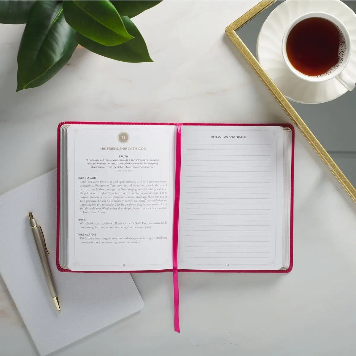 The 199 Prayers for My Husband journal combines thoughtful devotionals with elegant design to support intentional prayer and reflection for your marriage. Bound in raspberry-red faux leather with heat-debossed framing and gold foil accents, this guide features 199 powerful prayers across 416 gilt-edged pages. Its two-color interior and attached ribbon marker provide a refined writing experience, helping you focus on truth and invest deeply in your relationship through prayer.