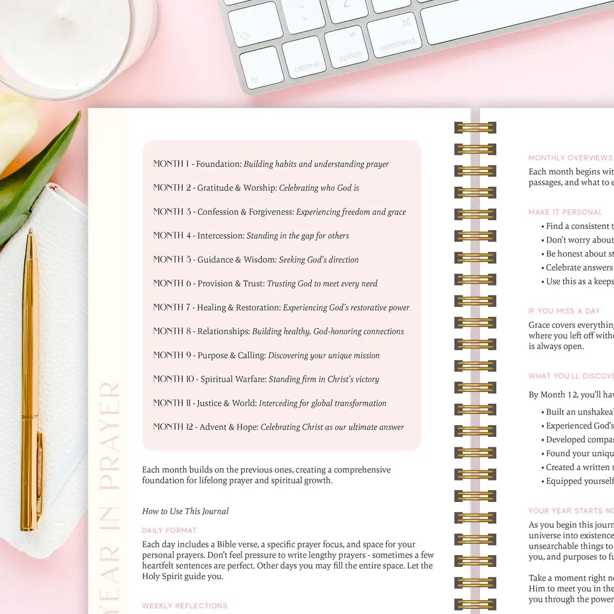A Year in Prayer guides you through 12 monthly themes—from gratitude and healing to relationships and purpose—with 240 daily prayers and reflective prompts. The undated format lets you begin whenever you're ready, while the 5-day weekly structure builds sustainable prayer habits without overwhelm. Each day includes focused prayer intentions, biblical verses for inspiration, and dedicated space for your personal reflections. Whether used for individual devotions or small group study, this comprehensive journal transforms your spiritual practice through intentional, guided prayer that deepens your connection to faith and purpose.