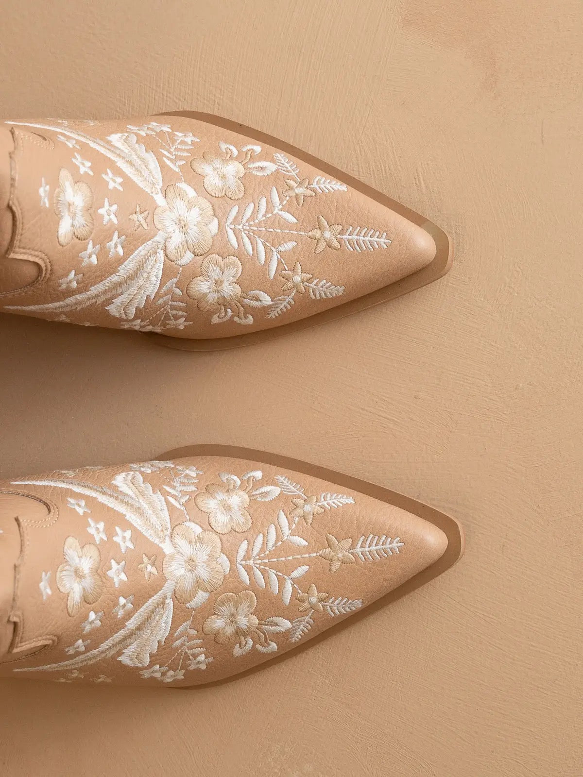 The Apricot Embroidered Cowboy Bootie features intricate floral embroidery on a vegan leather upper, combining style with ethical materials. Designed with a 7" shaft height and a comfortable 13" shaft circumference, these slip-on booties offer ease of wear. The padded insole ensures cushioning for all-day comfort, while the 2.5" printed heel adds subtle height and a distinctive touch. Perfect for those seeking a blend of classic western flair and modern craftsmanship.