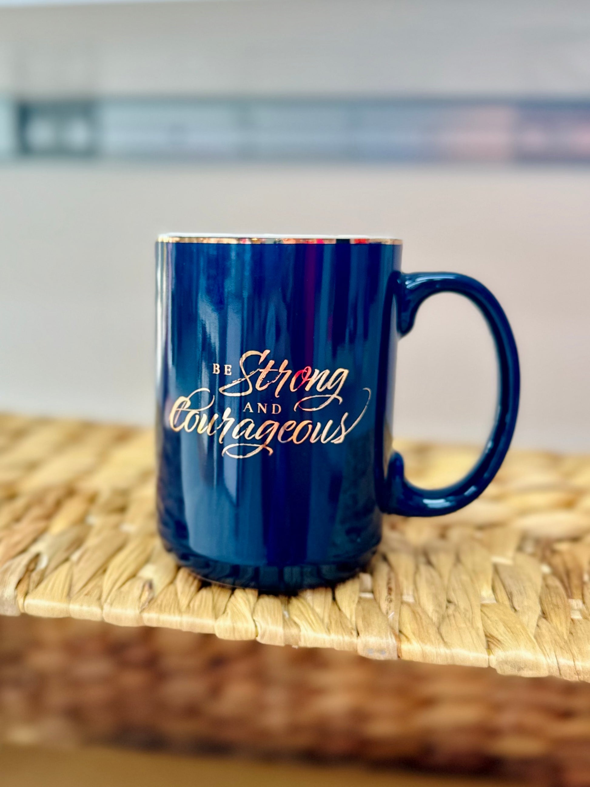 The Be Strong and Courageous Navy Ceramic Coffee Mug is a large mug on one of our best-selling sizes. This coffee mug also features one of the most popular verses.
