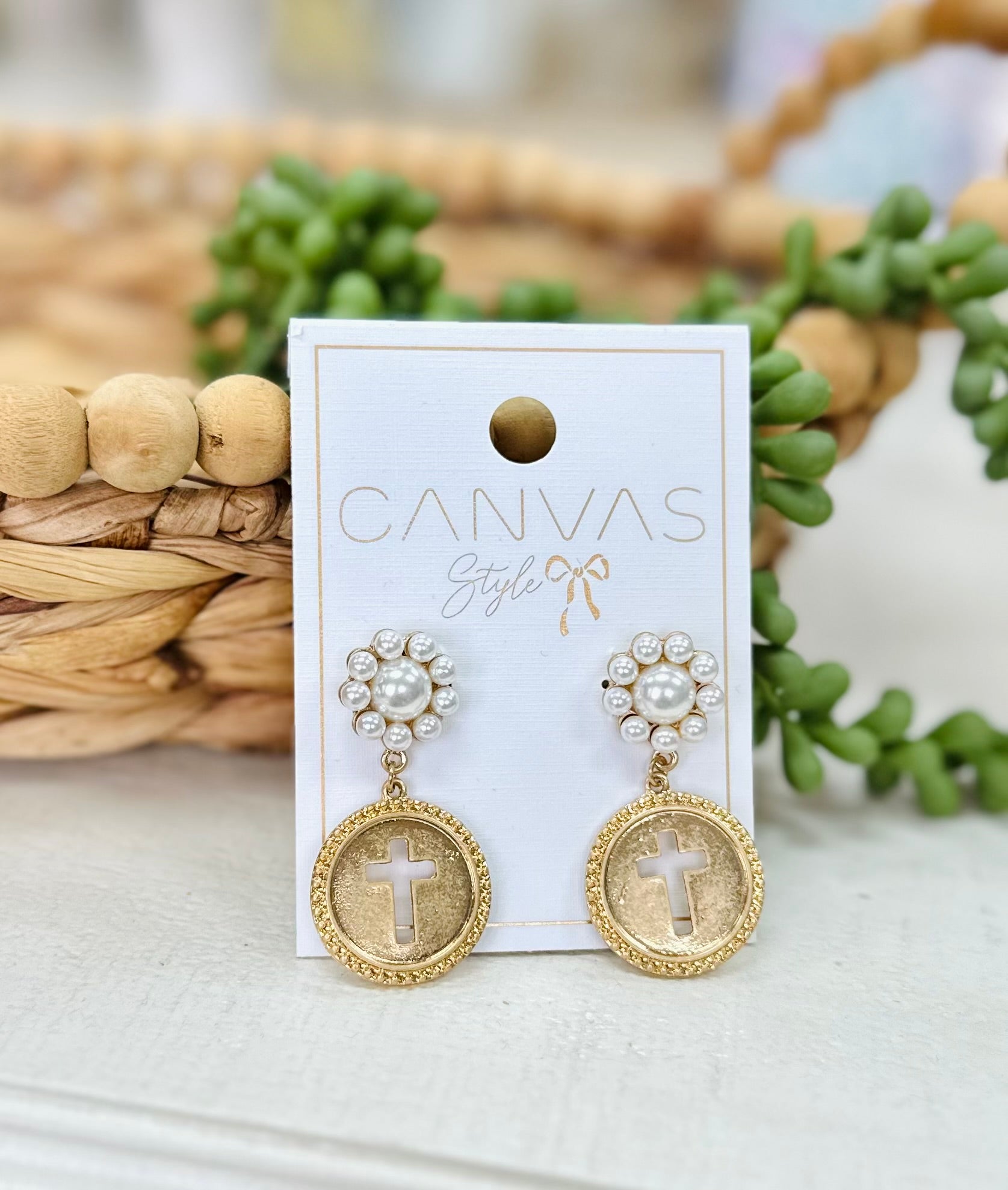 Canvas Style Coin Cross Pearl Drop Earrings