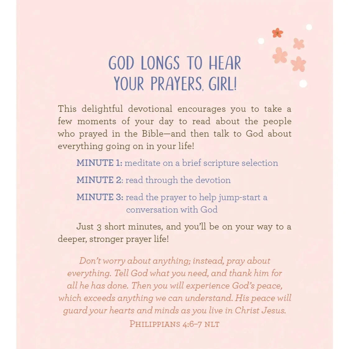 This delightful new devotional encourages you to take a few moments of your day to read about the people who prayed in the Bible—and then talk to God too. . .about everything going on in your life! Dozens of just-right-sized readings pack a powerful dose of comfort, encouragement, and inspiration and are designed to help you grow a deeper, stronger prayer life!