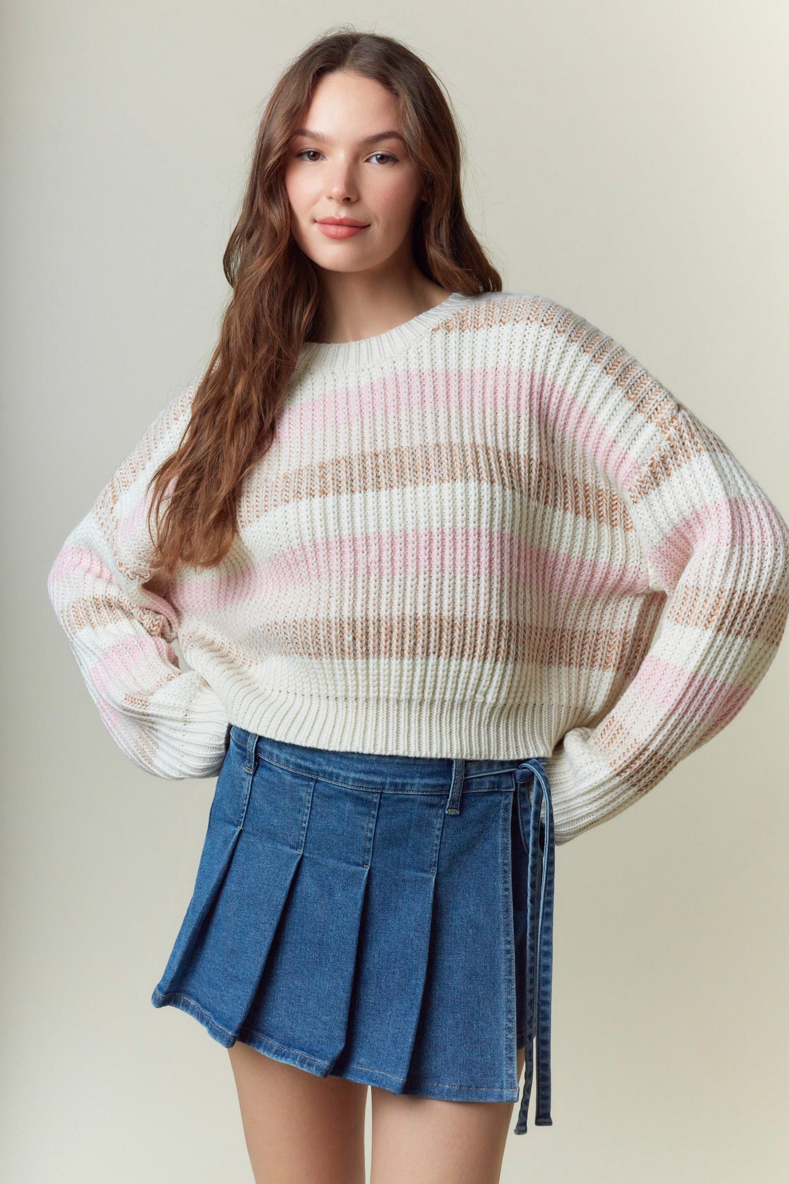 Crew Neck Multi Stripe Cropped Sweater