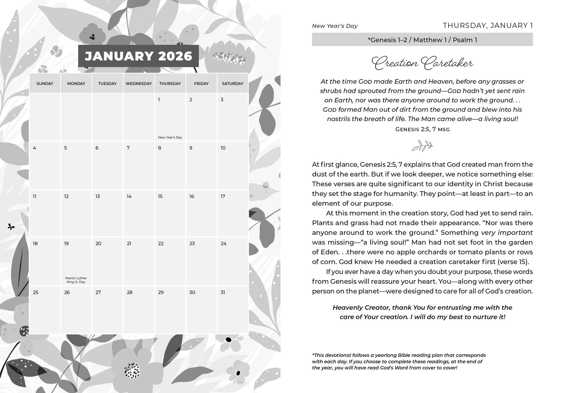 God’s Word provides daily wisdom and encouragement throughout 2026 in this carefully crafted devotional. Each day, uncover your identity in Christ—accepted, forgiven, redeemed, and deeply loved by a Father who knows you intimately. Featuring scripture readings aligned with a Read-Through-the-Bible-in-a-Year plan, along with thoughtful devotionals and prayers, this devotional supports personal growth and spiritual strength. Perfect for daily reflection or as a meaningful gift, it equips women to embrace their purpose and walk confidently in faith every day.