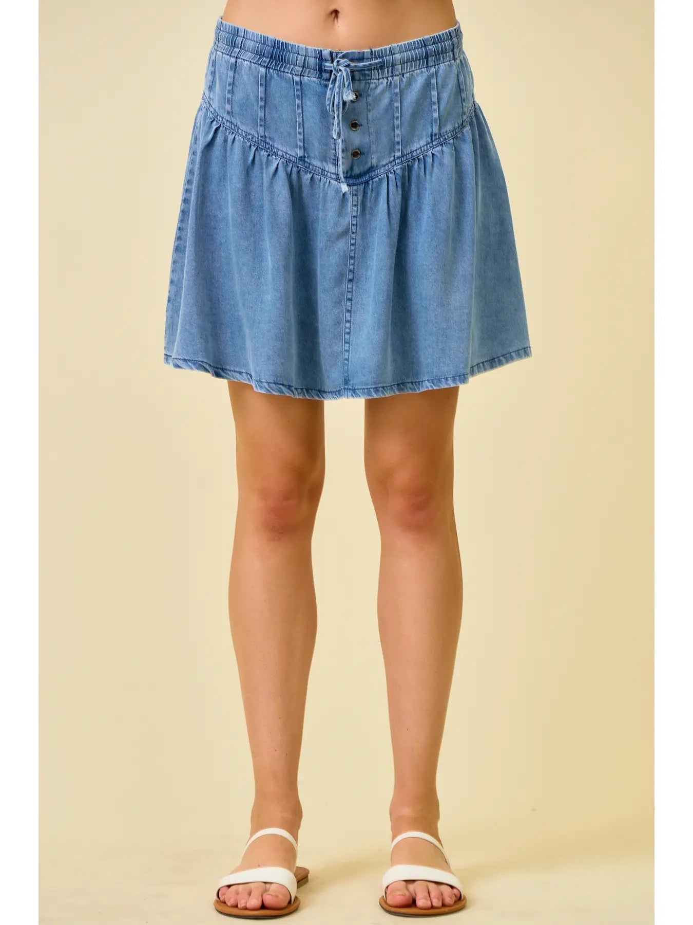Twirl into your next adventure in this adorable denim mini skirt! Crafted from soft, lightweight fabric, it features a charming pleated waistband that flatters your figure while a flared hem gives you freedom to move. The front button closure pairs perfectly with a tie detail for a secure, adjustable fit that works with your body. With a mid-rise cut and elasticized back waistband, you'll enjoy all-day comfort without sacrificing style. Whether you're heading to brunch or a casual hangout, this versatile piece is ready to become your new favorite.