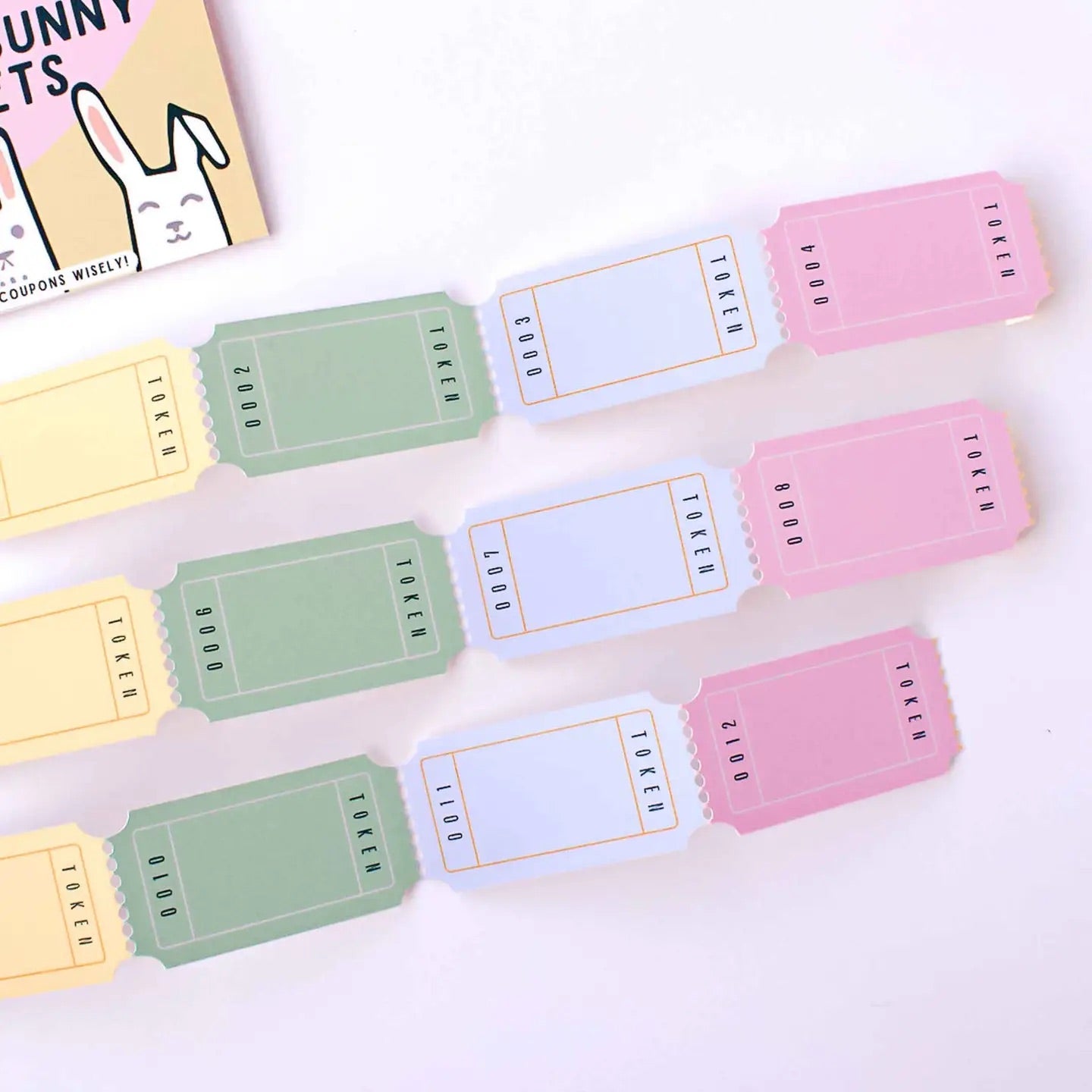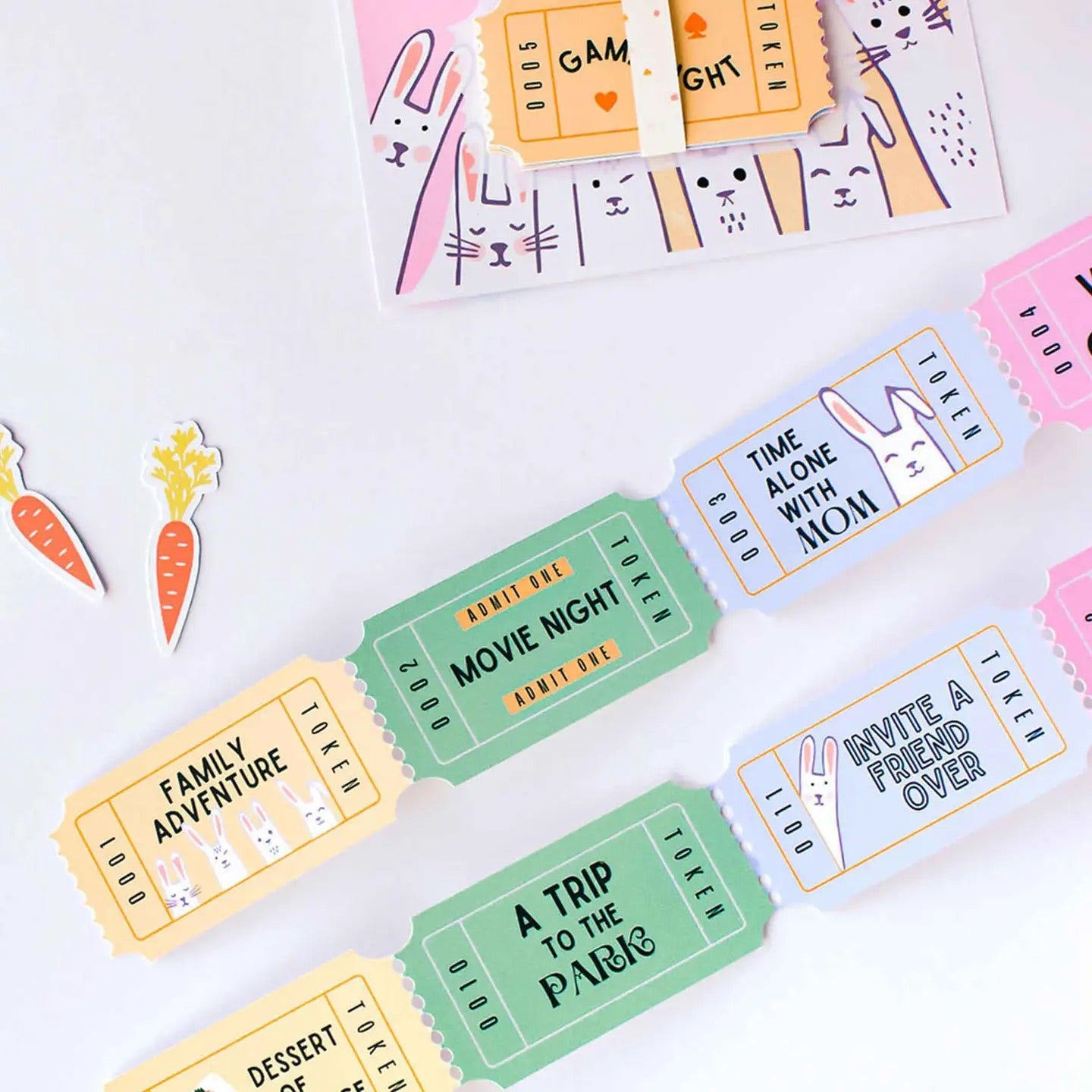 Our love tokens are a fun and creative way to celebrate any occasion with your loved ones. They are a great way to spend more quality time together! Includes: • A string of 12 coupons - Select pre-filled coupons (see messages below) or let the kids write their own messages by selecting "Blank Coupons" • Retail Packaging: Clear Box Who is it for? • Kids • Perfect for Easter, Christmas Stocking stuffer, or birthdays! Tickets Included (for the pre-filled option): • Family adventure, Admit one: Movie night, Time alone with mom, Wild Card, Game night, Time alone with dad, spend $5 at the store, Dessert of choice, A trip to the park, Invite a friend over, + 2 blank coupons. Dimensions: • Ticket (1): 2.3x1.1" | 6x3cm - raffle ticket size • Box: 6.75 x 2.75 x 1.25"