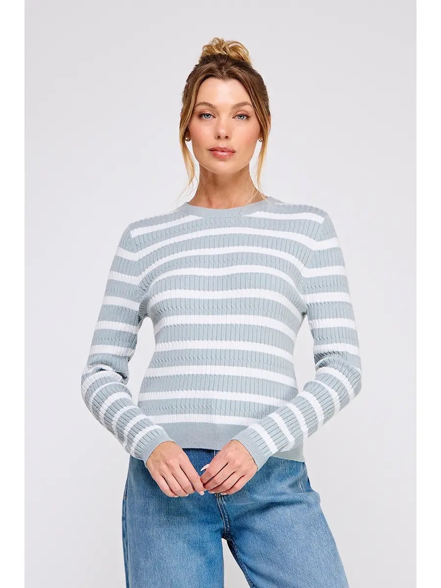 This fine gauge striped sweater features a tight cable knit pattern crafted from a blend of viscose, polyester, and nylon. Its refined texture offers a lightweight yet warm layer, ensuring both comfort and durability. Ideal for layering or wearing alone, this sweater combines classic cable detailing with a modern striped design for a versatile, polished look.
