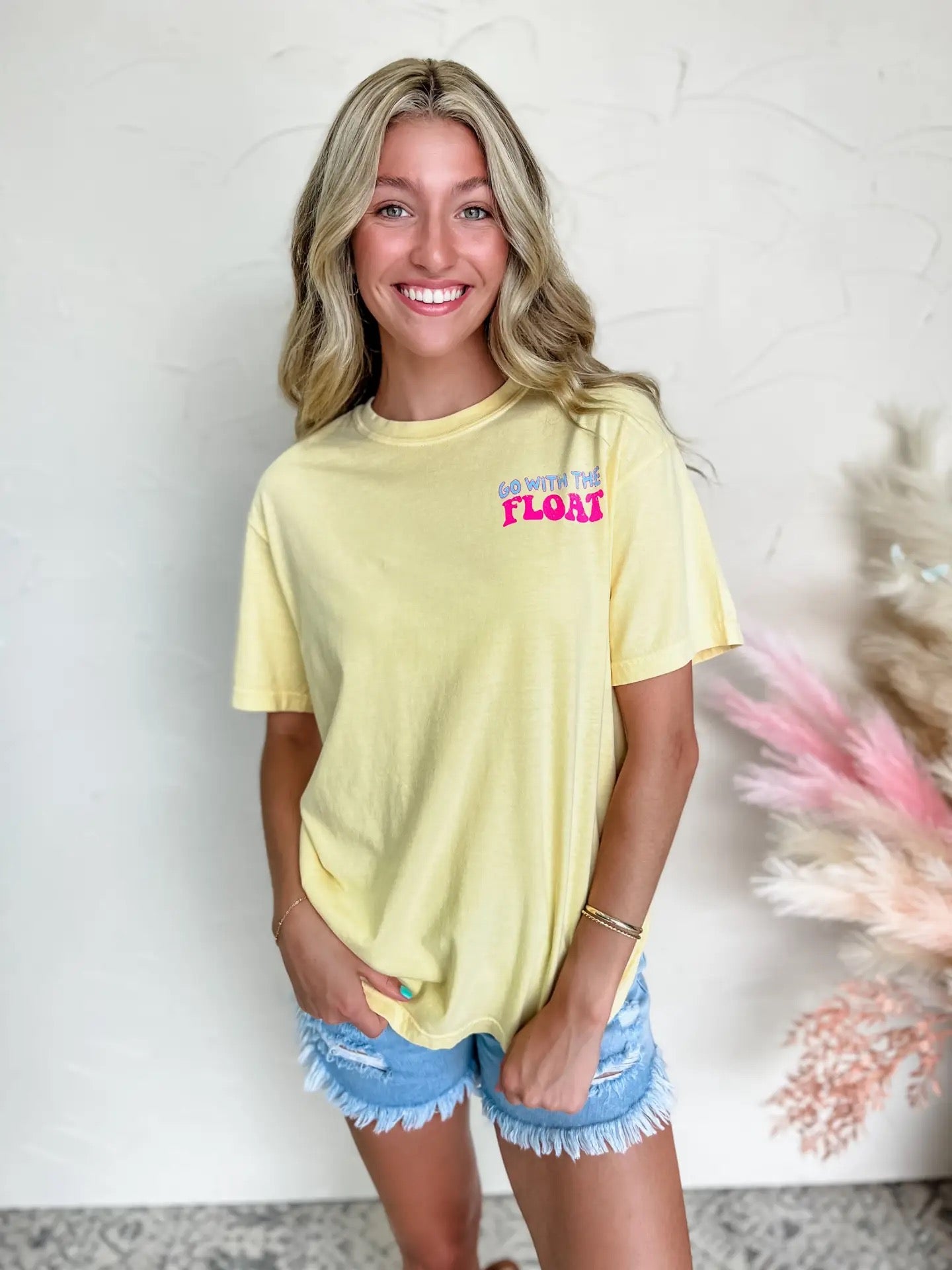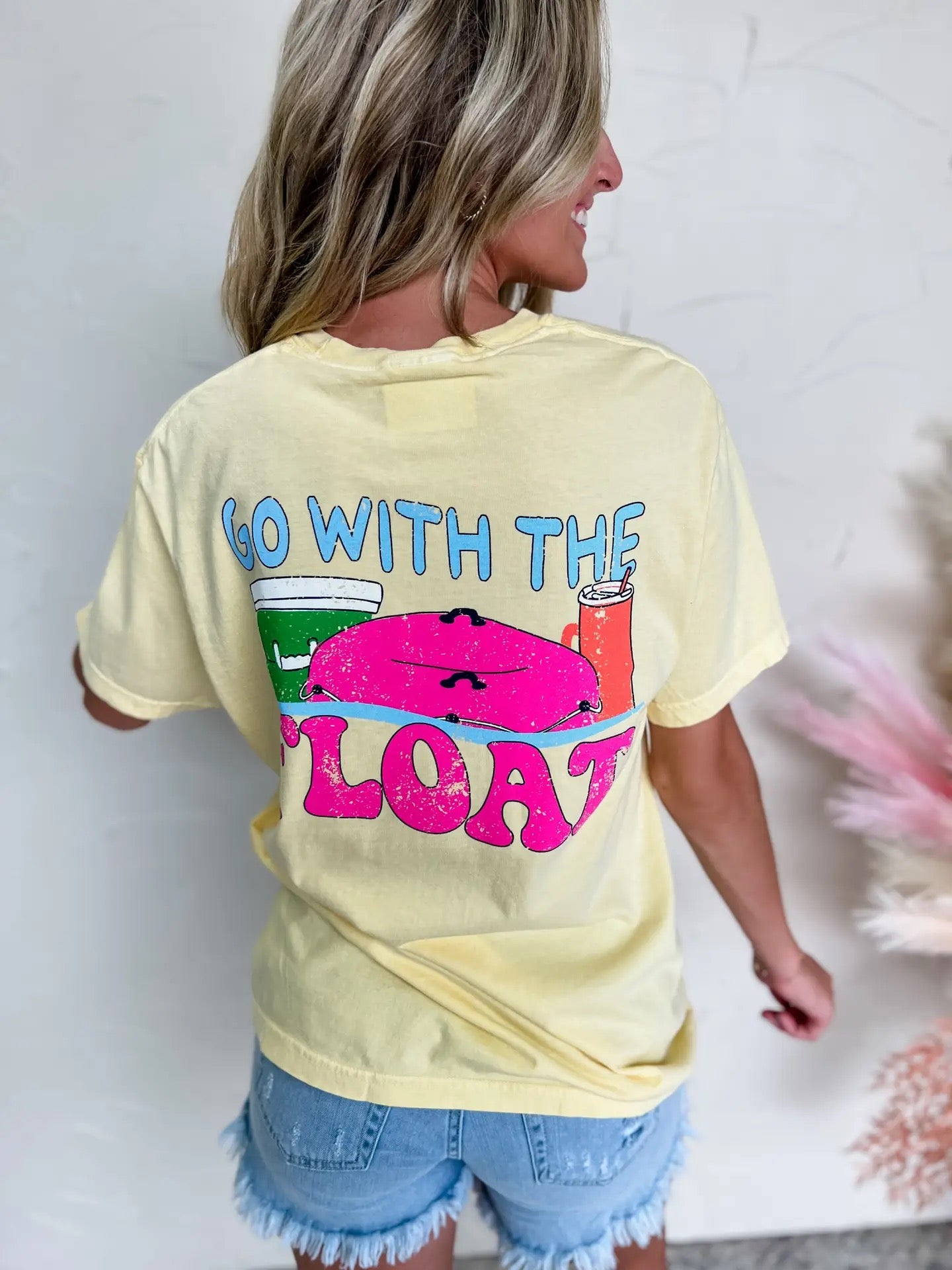 This Go With The Float Tee features a vibrant direct screenprint on a 100% cotton Comfort Colors t-shirt. With its butter color and garment dyed texture, this tee not only adds a pop of color to your wardrobe but also provides maximum comfort. Perfect for any casual occasion.