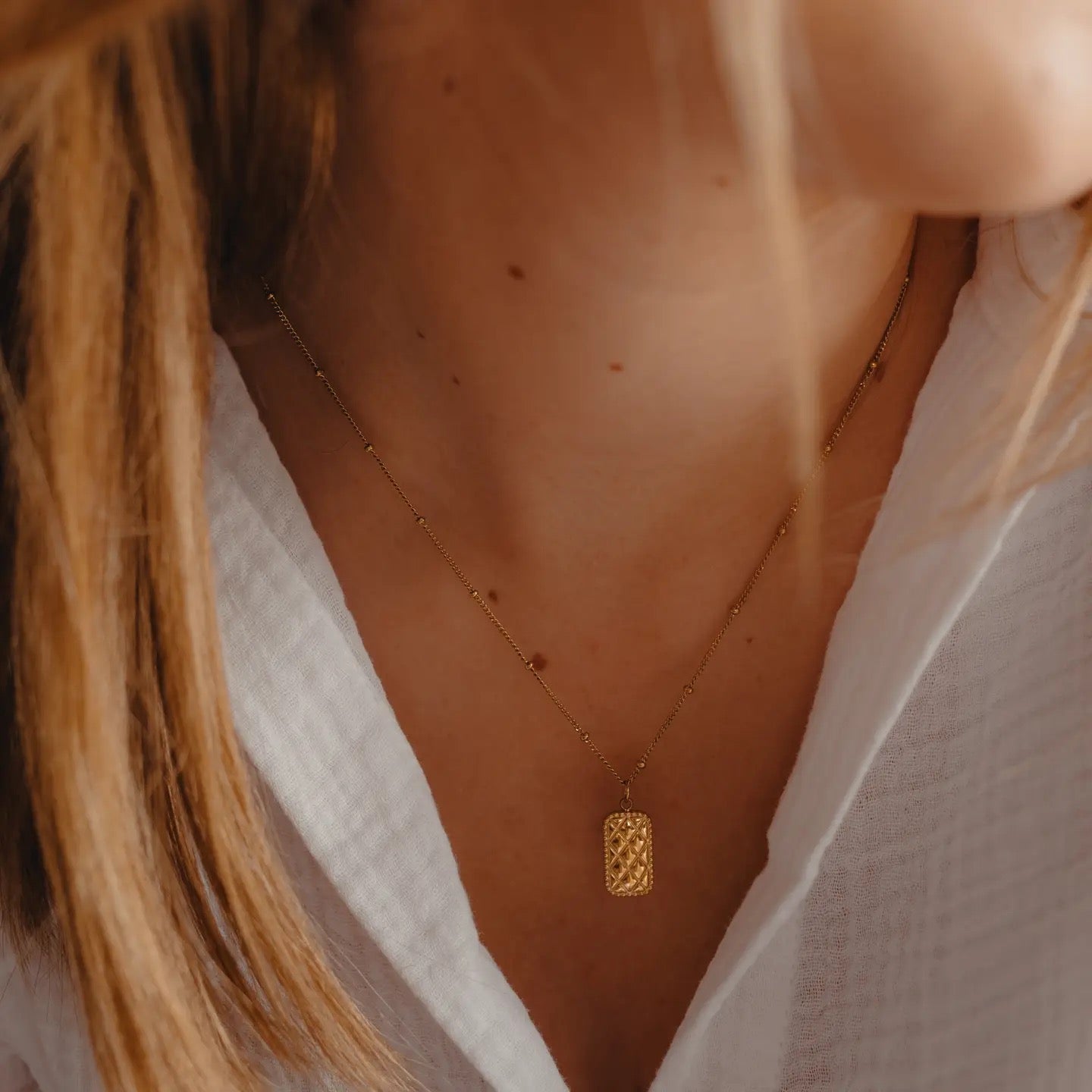 Details in the Design: This piece has a criss cross patterned piece representing that we may not see God's plan as we go through the zig zags + curves but when we step back it is always beautiful. 18" Adjustable Chain 14kt Gold over stainless steel Tarnish + Water Resistant Pendant measures 3/8" x 5/8"