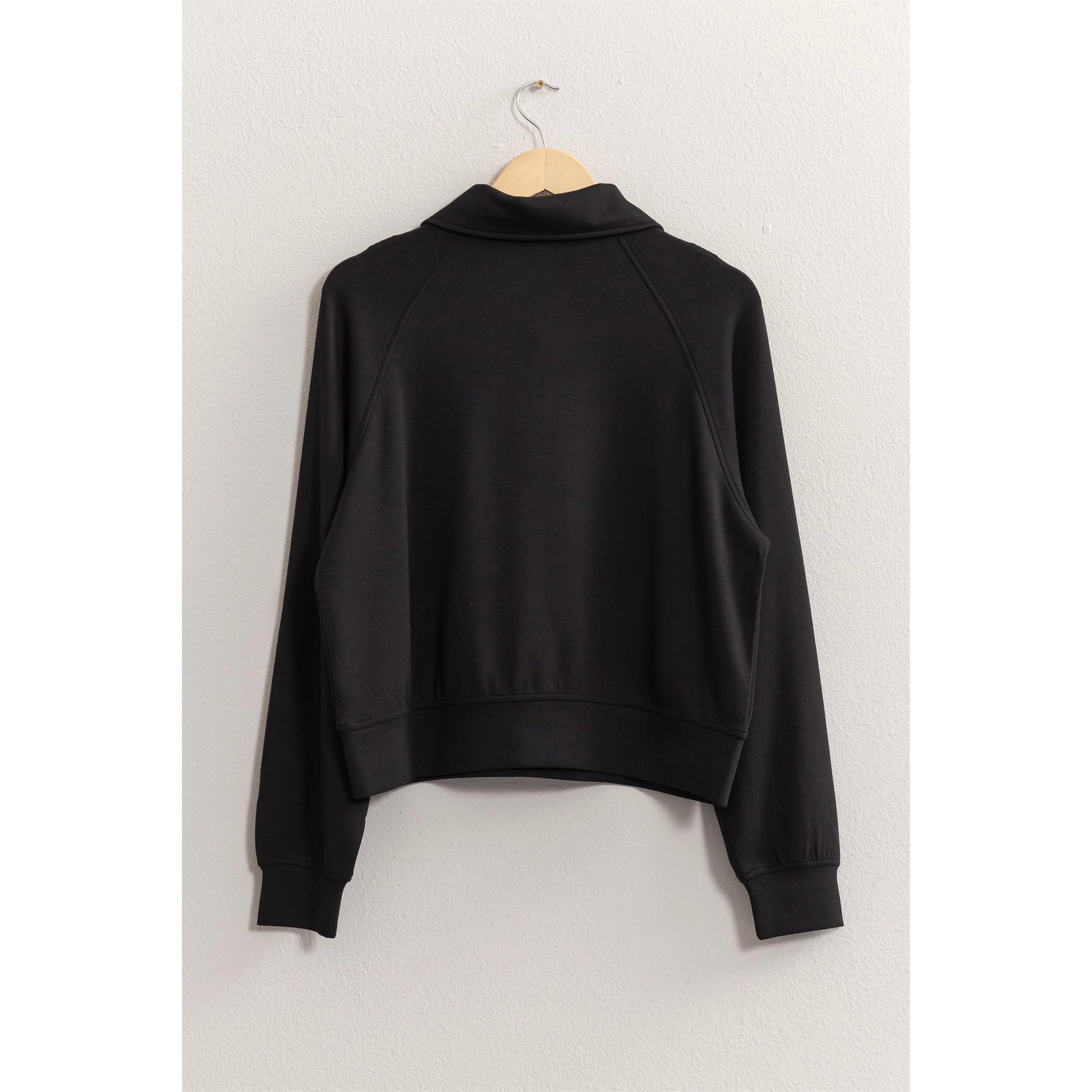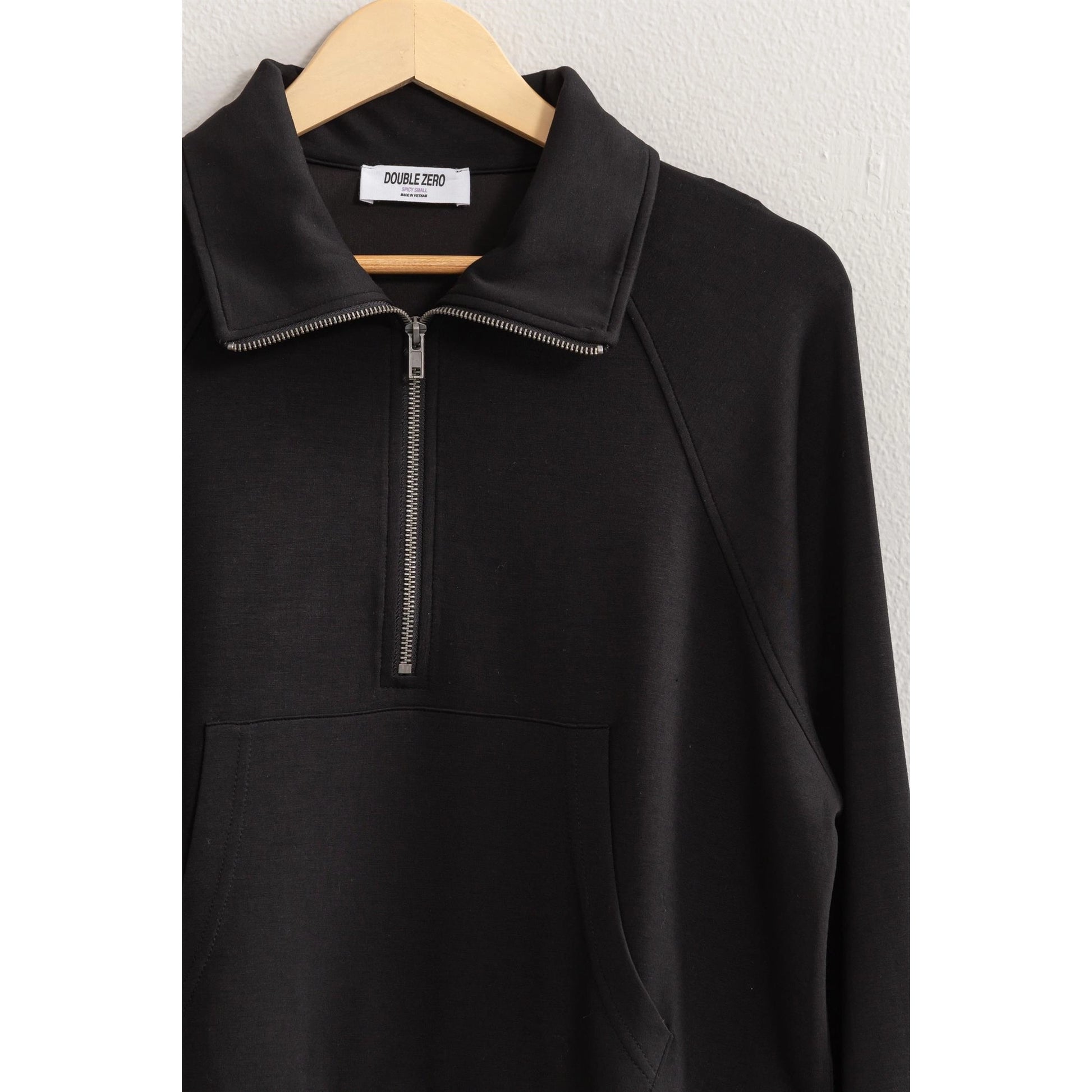 Stay warm and stylish in our Half Zip Black Collar Sweatshirt. Made with a blend of 46% rayon, 47% polyester, and 7% spandex, this sweatshirt offers both comfort and flexibility. The kangaroo pouch adds functionality, making it a perfect addition to your everyday wardrobe.