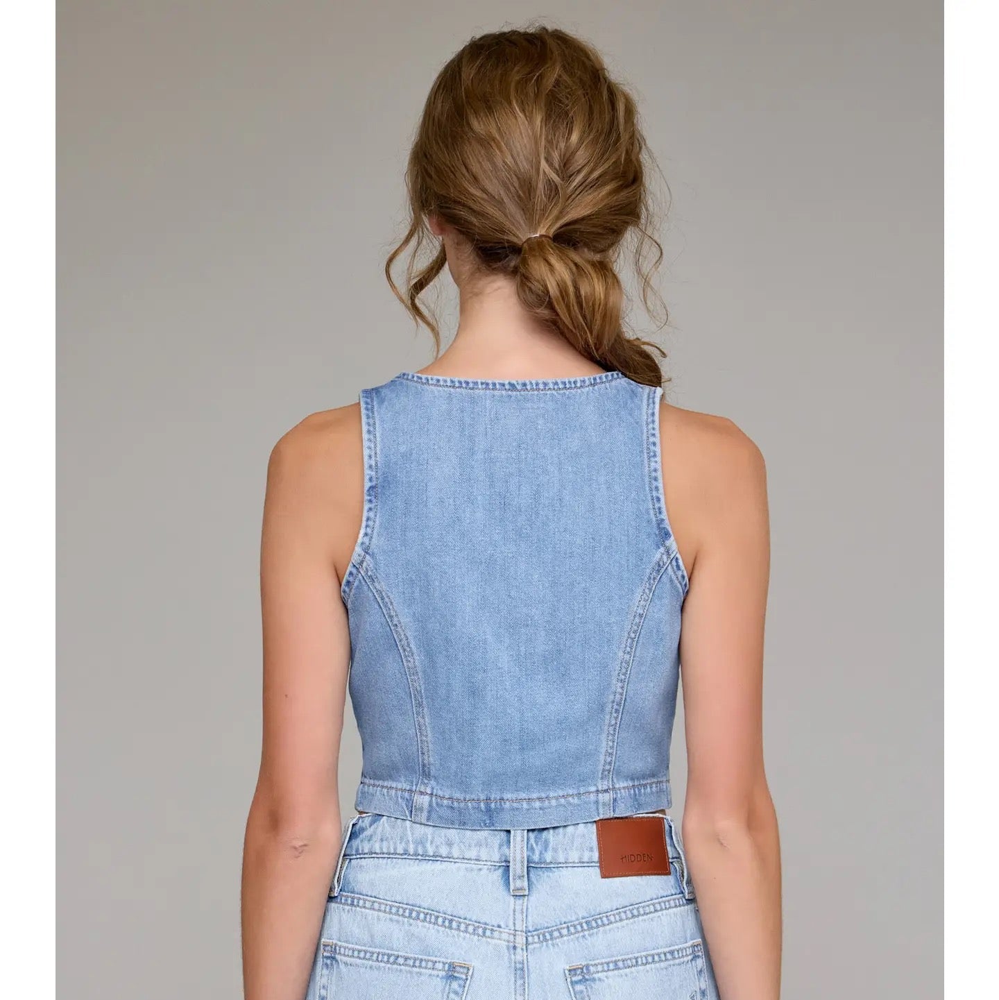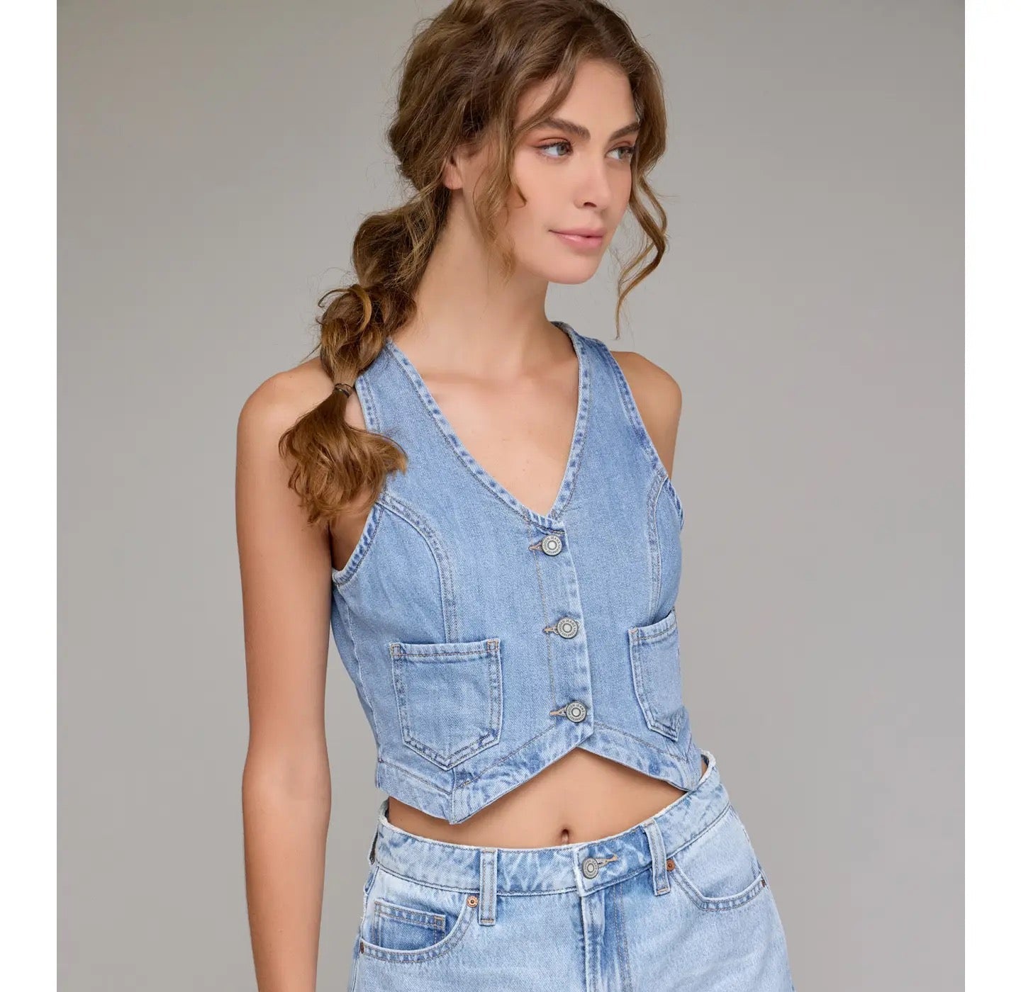 Crafted from a comfortable cotton-rayon blend, this cropped fitted vest features a light wash finish for a modern, versatile look. The soft fabric drapes beautifully while maintaining its shape, making it perfect for layering over tees, tanks, or long sleeves.