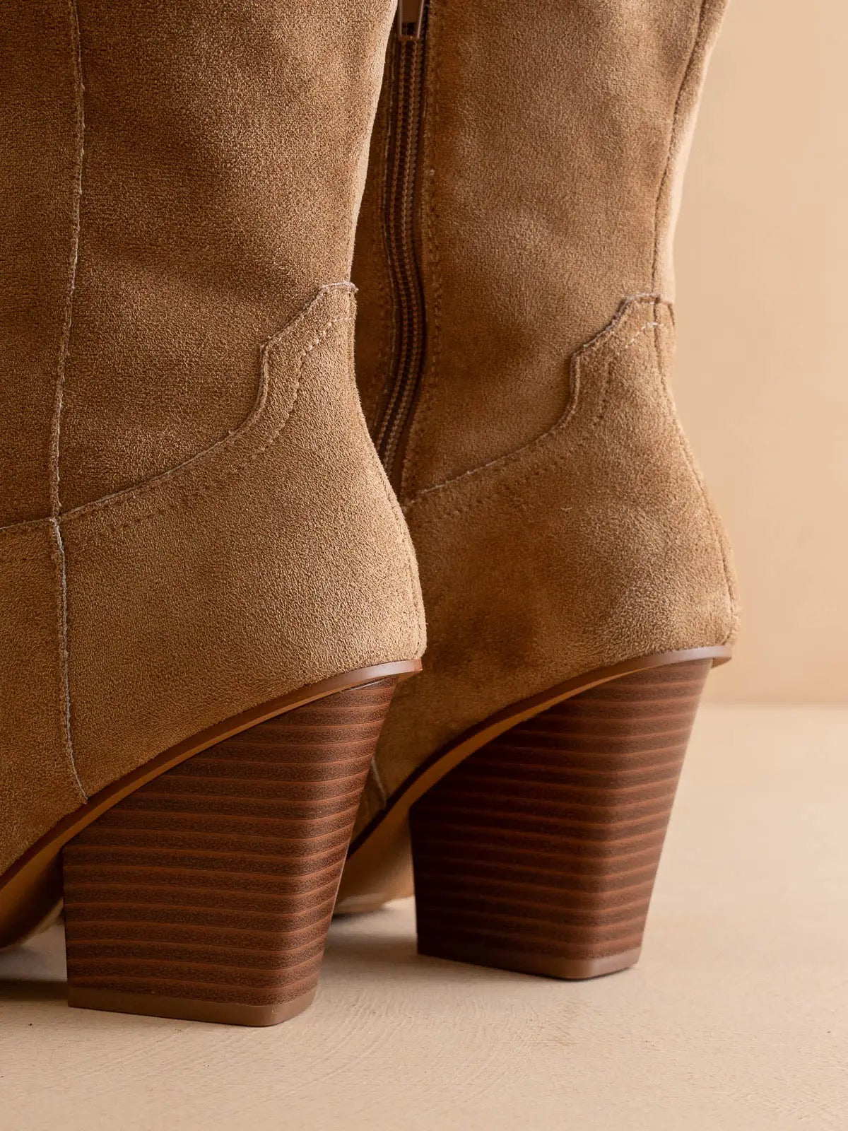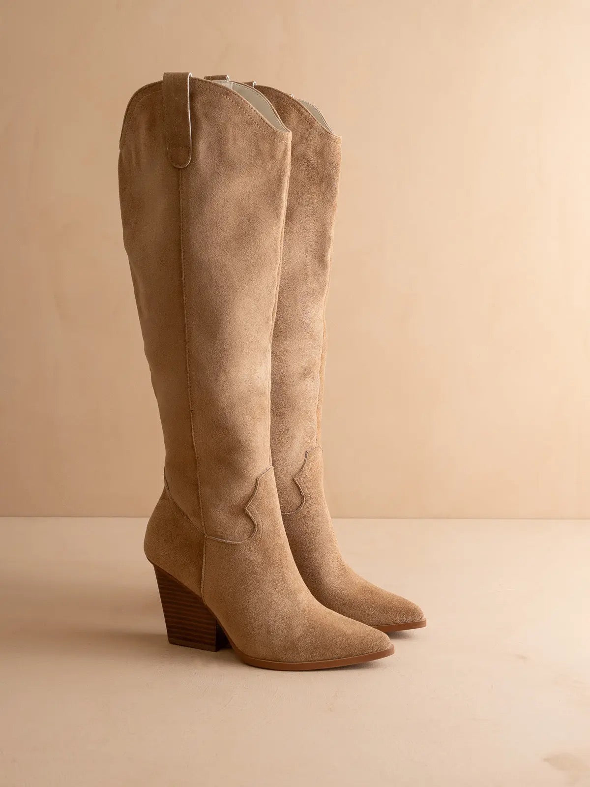 The Latte Sued Knee High Western Boot offers a refined take on classic cowboy style with its sleek silhouette and high-quality materials. Crafted with a man-made suede upper and featuring a DreamCloud cushioned insole, these boots ensure both style and comfort. The 18.25" shaft and 3.5" leather wrap heel provide a flattering knee-high fit, while the zipper closure allows for easy wear. With a 16.25" shoe opening circumference and a 13.75" shaft circumference, this boot blends practical design with expert craftsmanship for a versatile wardrobe essential.
