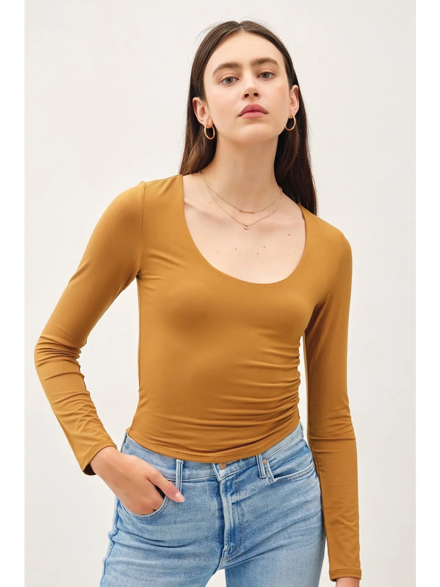 Get ready to stretch your fashion game with our Long Sleeve Scoop Neck Basic Top! Perfect for any occasion, this top features a stretchy fabric and a flattering round neck. Elevate your style in a comfortable and chic way.