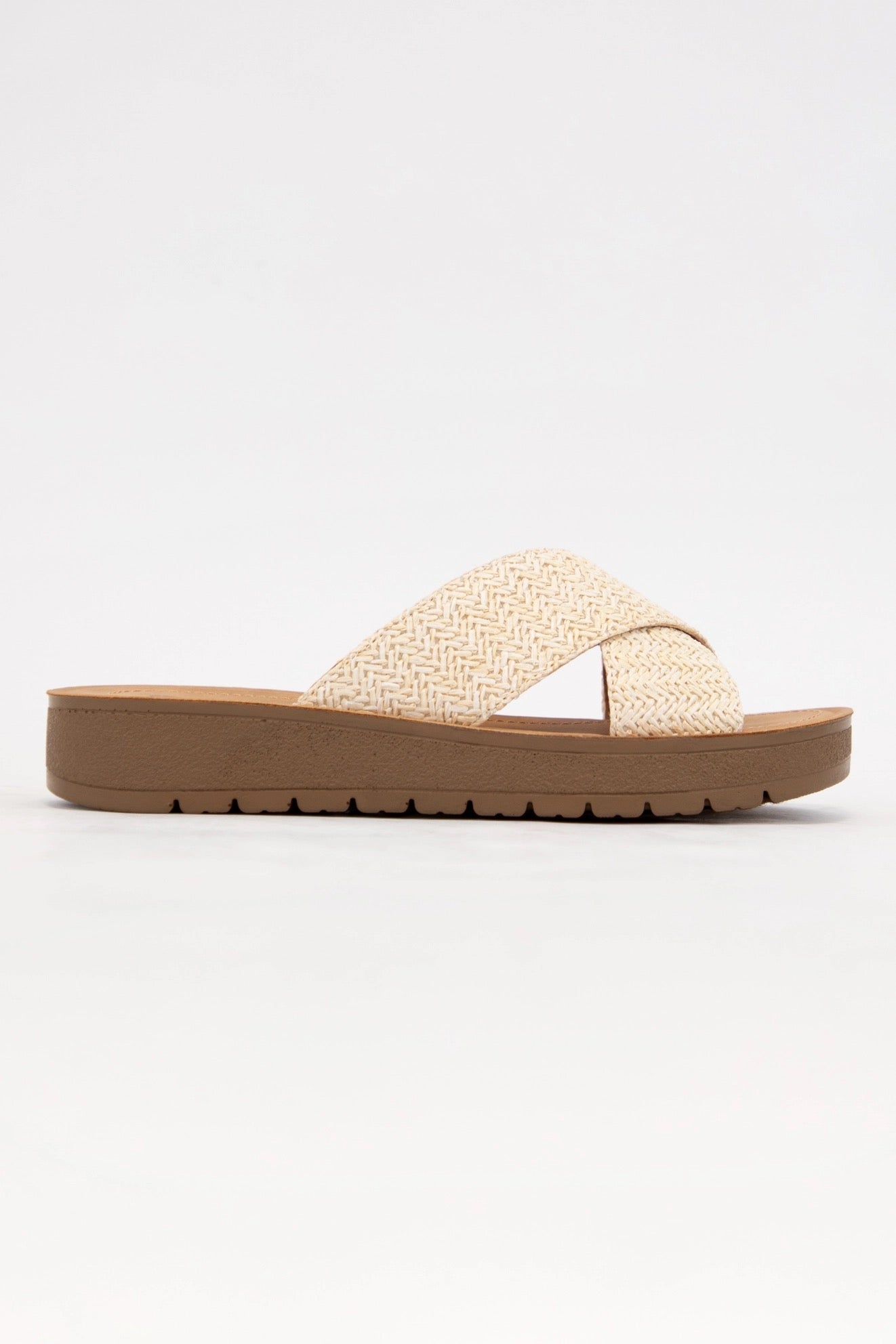 BOLD CROSS STRAP SANDAL LIGHTWEIGHT FOAM SOLE SLIP-ON STYLE FAUX PU/ NUBUCK PU/ RAFFIA UPPER HEEL HEIGHTS: 1.35"