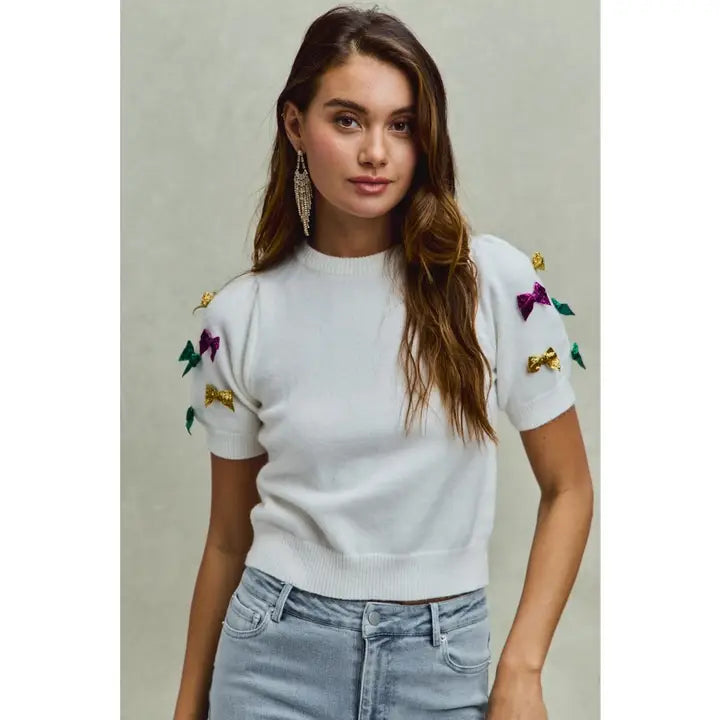 Mardi Gras Glitter Bow Sleeve Sweater Top