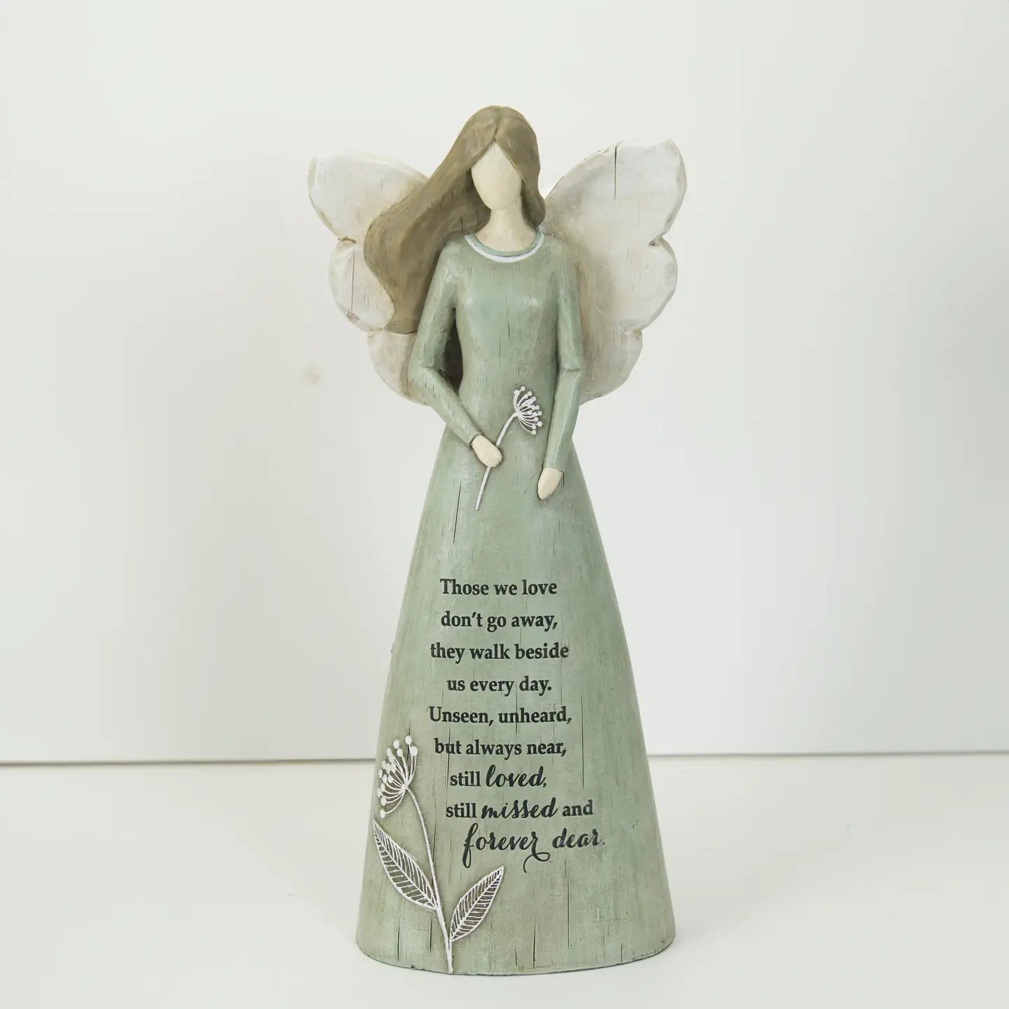 Memorial angel figurine crafted of resin with a wood carved look and then handpainted in sage green tones. Floral detail front & back
