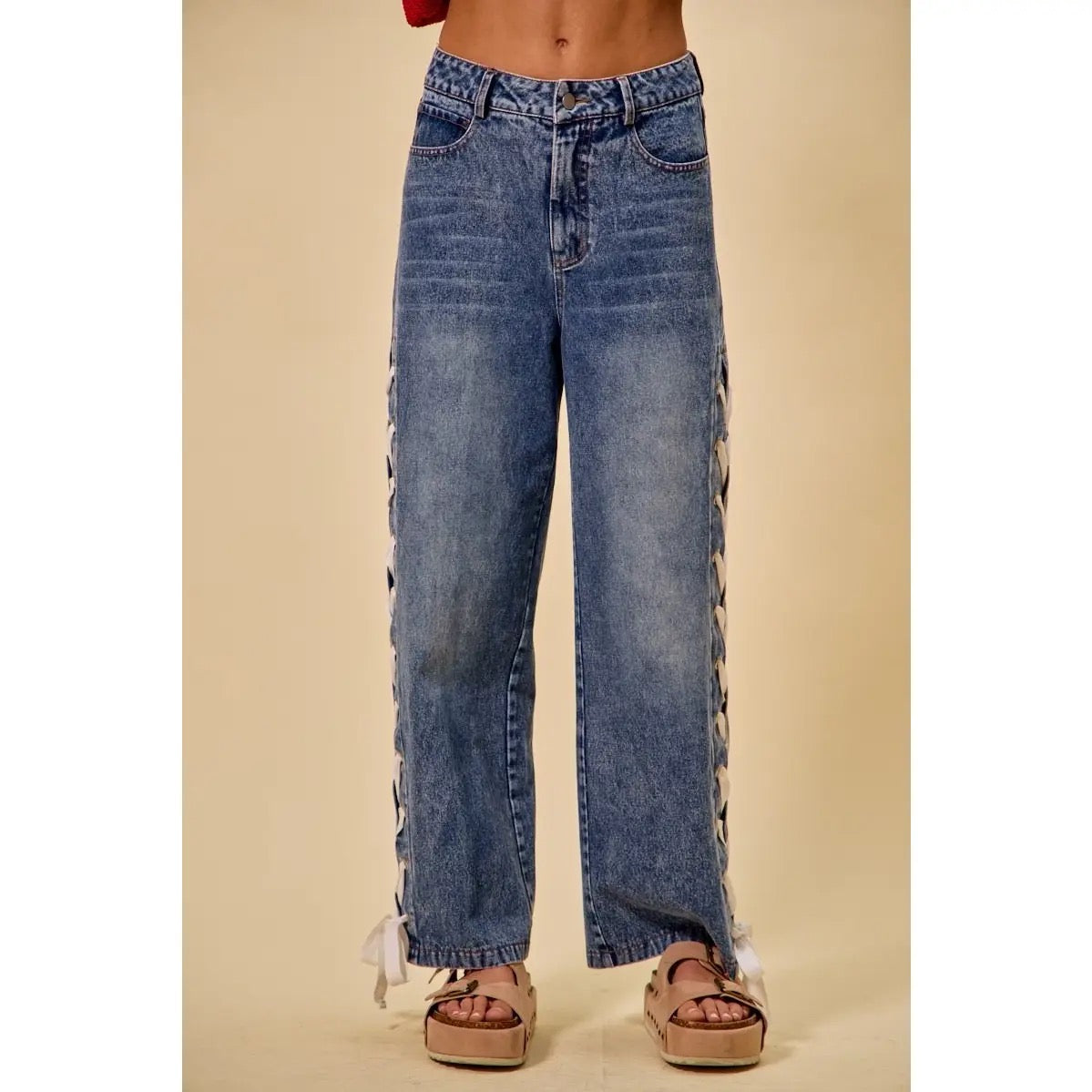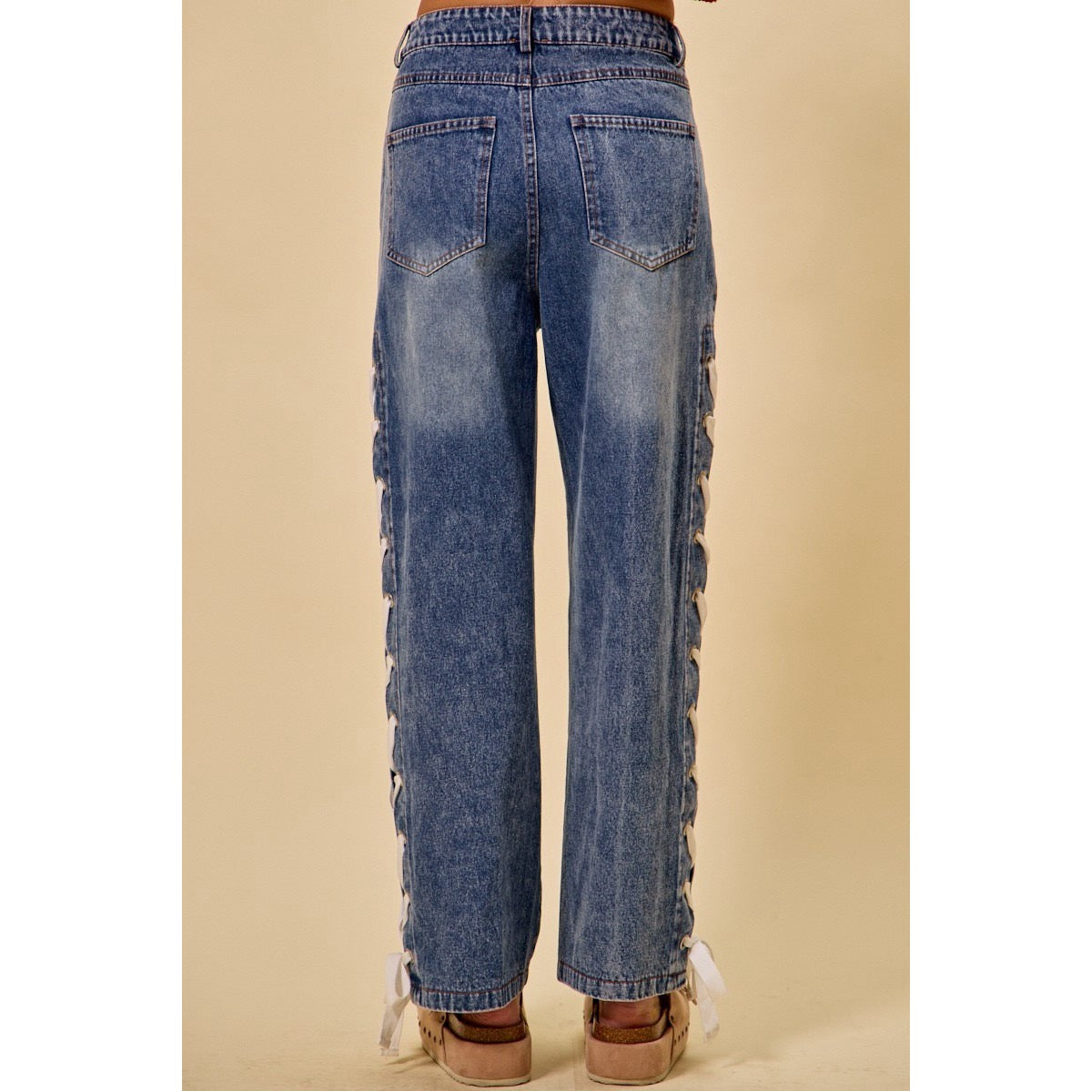 Mid Rise Straight Leg Side Lace Up Jeans