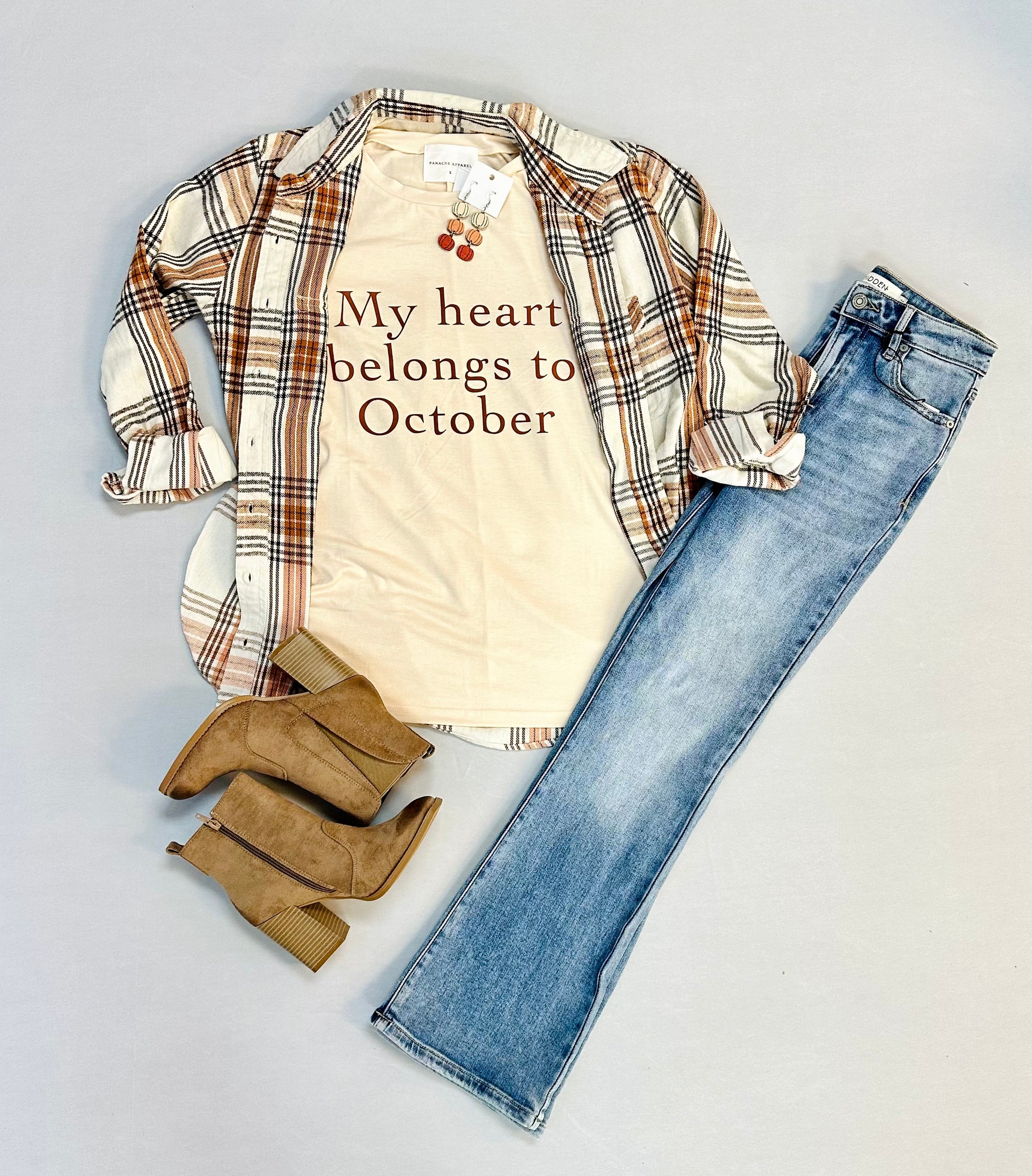 Experience the cozy comfort of fall with our My Heart Belongs to October Tee. Made from a stretchy and soft material, this short sleeve tee is perfect for all your autumn adventures. Show your love for this beautiful season with this must-have addition to your wardrobe.