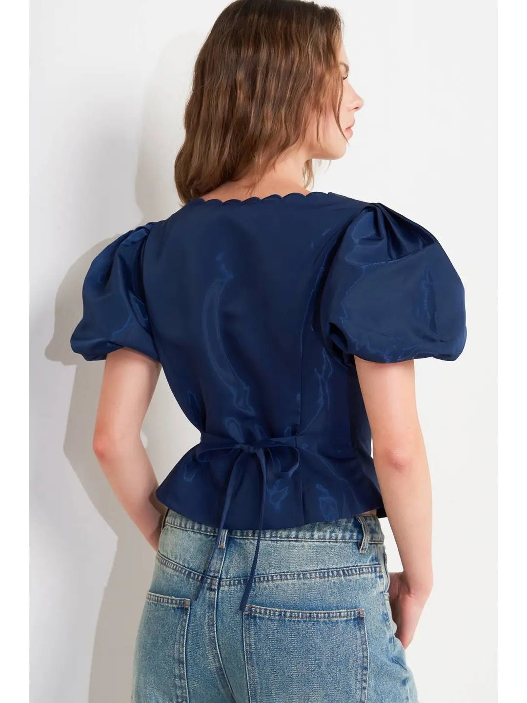 This navy solid top combines classic design with refined details. Crafted from 100% polyester with a comfortable cotton lining, it features a scalloped edge square neckline and short puff sleeves for a flattering silhouette. The front button-down closure is accented with elegant pearl buttons, adding a subtle touch of sophistication suitable for both professional and casual settings.