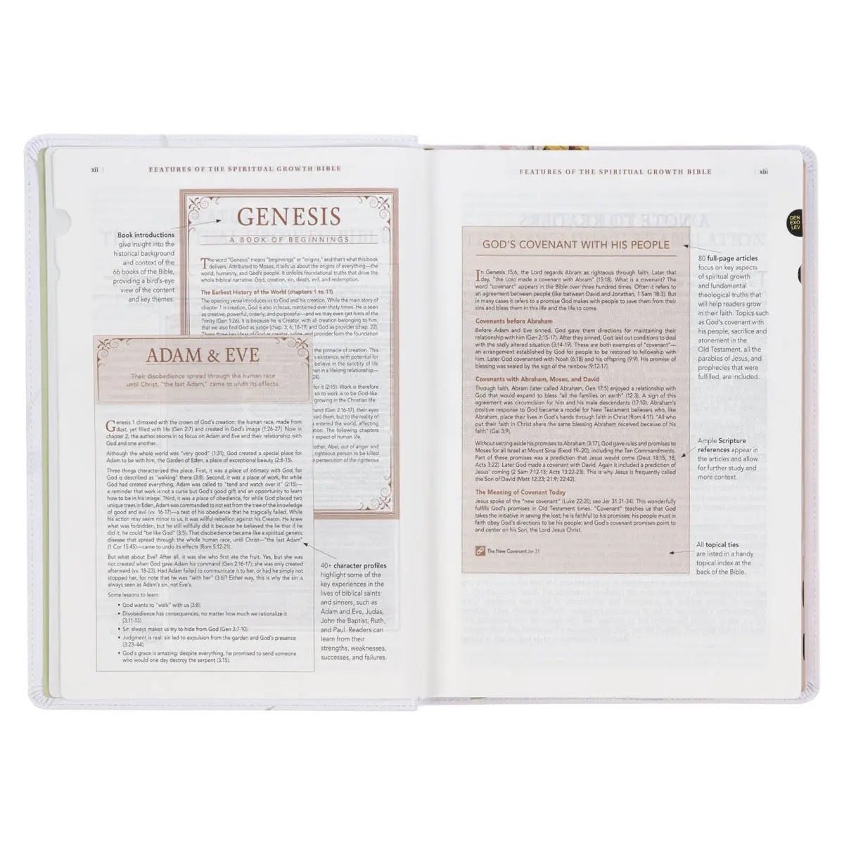 The NLT Spiritual Growth Bible in a cream-colored faux leather cover features an elegant floral design with a rose gold-foiled title. It offers clear Introductions and bird’s-eye views of each Bible book’s themes, complemented by over 800 sidebar articles and 80 full-page insights focused on spiritual growth and core theological truths. With 40+ character profiles, 2,300+ topical ties, and 1,700+ cross-references, it supports deep study and reflection. Additional features include a topical index, presentation page, two ribbon markers, thumb index, gilt-edged pages, and a readable 9-point font size for a comprehensive and accessible experience.