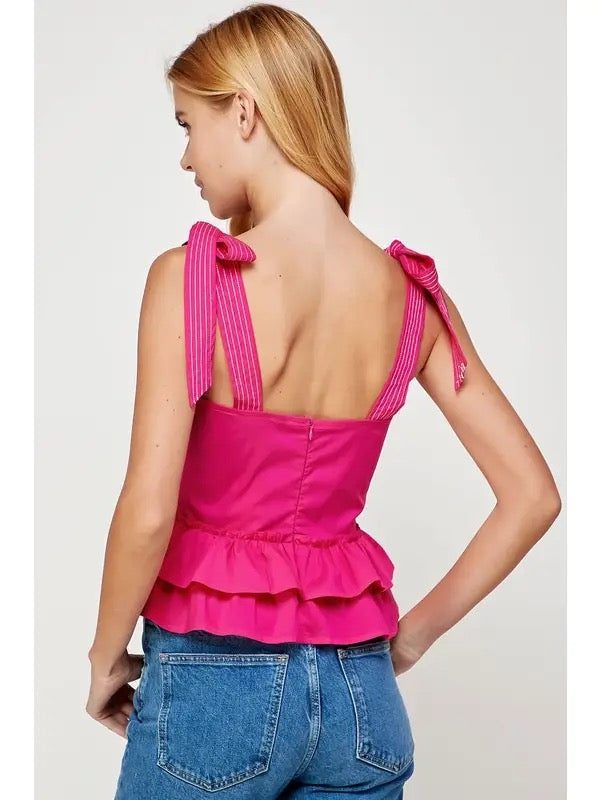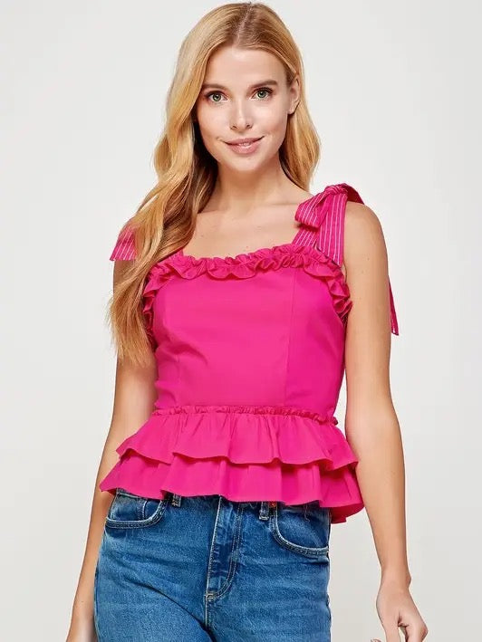 Ruffle sleeveless top in stretch poplin fabric. This style features self adjusting top stitched ties at shoulders, double ruffled hem, and hidden zipper closure at back.