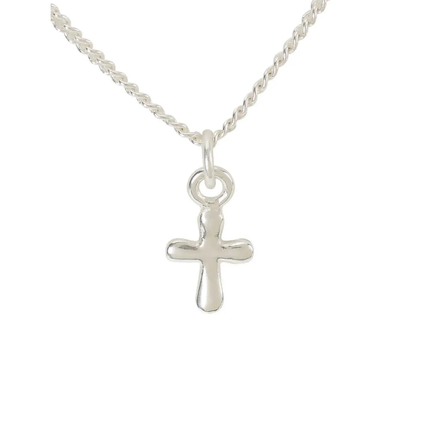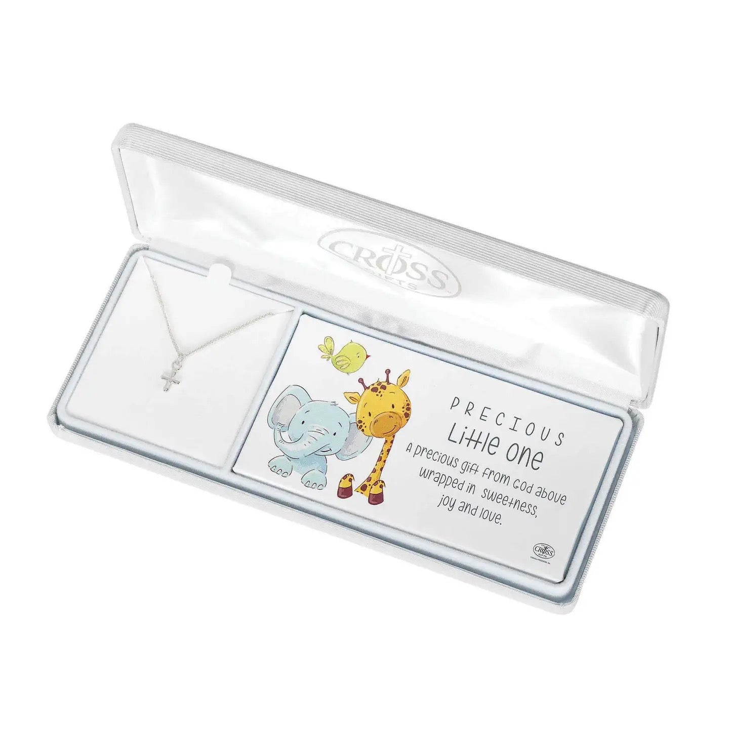 Sized just right for a baby, this necklace has a dainty silver plated puff cross pendant and 13” silver plated chain. Pendant measures 5/16”l X 3/16”w. Necklace comes in a white fabric covered presentation gift Box with fun animal design and these words: “precious little one - a precious gift from God above, wrapped in sweetness, joy and love.”