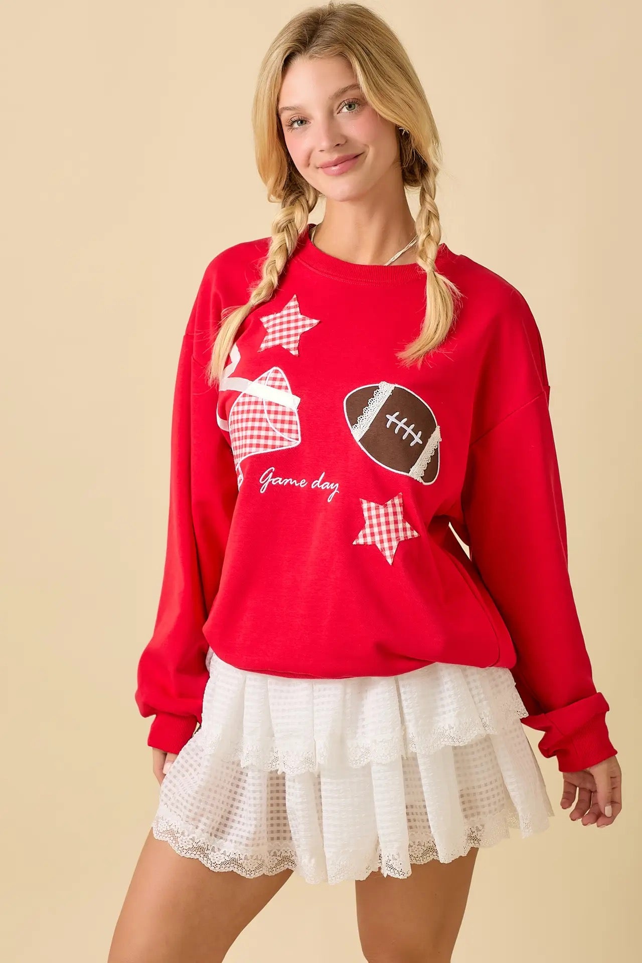 This Football Game Day Patchwork Long Sleeve Crewneck Top combines comfort and style with a balanced blend of 50% cotton and 50% polyester. Designed for durability and breathability, it offers a soft feel while maintaining shape and color after multiple washes. Its patchwork design adds a unique, sporty aesthetic perfect for game day or casual wear. The crewneck cut ensures a classic fit that layers easily, making it a versatile addition to any wardrobe. Ideal for fans seeking both performance and fashion in one garment.