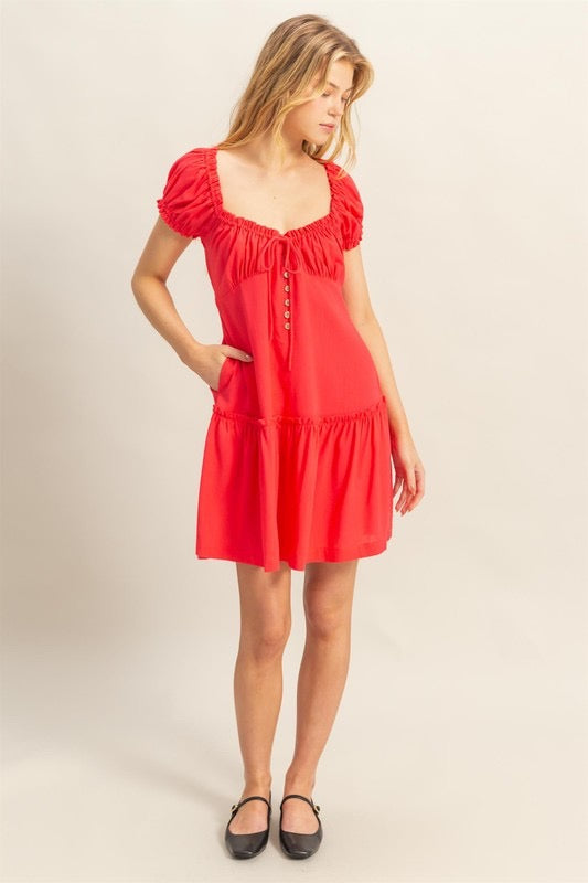 Effortlessly stroll the beach in this flirty mini dress. Made with lightweight linen, the dress features a U-neckline with self-tie detailing and a buttoned front for a sweet touch. The flowy hem and babydoll silhouette make it perfect for warm summer days. Feel cute and comfortable with short sleeves.