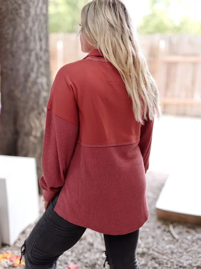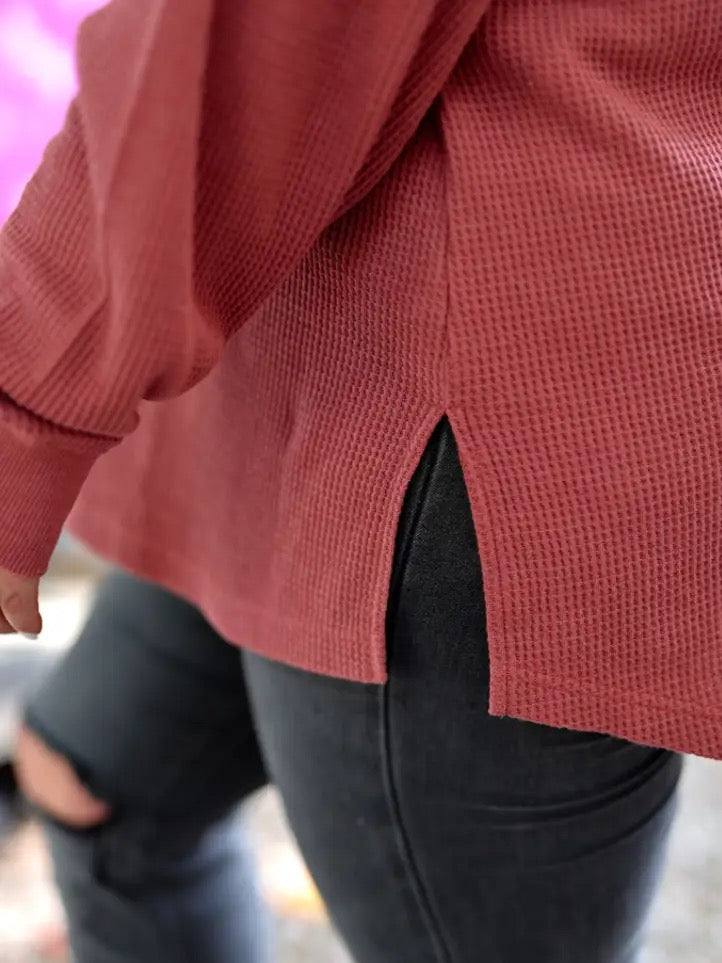 The Rust Waffle Knit Quarter Zip Pullover features a textured waffle knit fabric for warmth and breathability. Designed with a side slit and a scoop hem, it provides comfortable movement and a modern silhouette. The JLB fit offers a slightly oversized shape, combining relaxed style with effortless layering. Ideal for adding a cozy yet polished touch to your wardrobe.