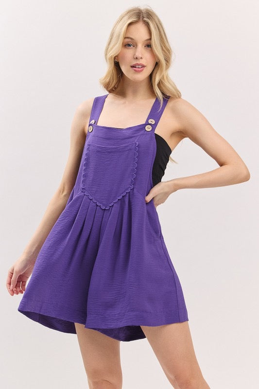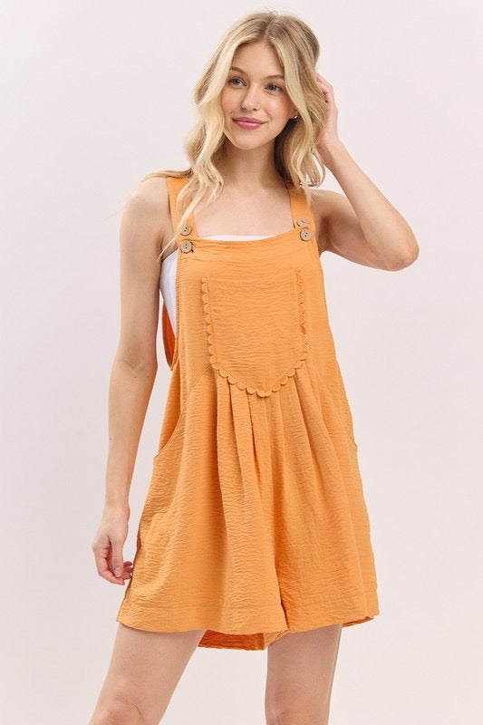 Crafted from 100% polyester, the Scallop Pocket Strap Romper offers a relaxed fit for all-day comfort. Its lightweight textured fabric ensures breathability, while adjustable button straps provide a customizable fit. Designed with an overall style and scallop-edged pockets, this romper combines practicality with subtle detailing, making it a versatile addition to your wardrobe.