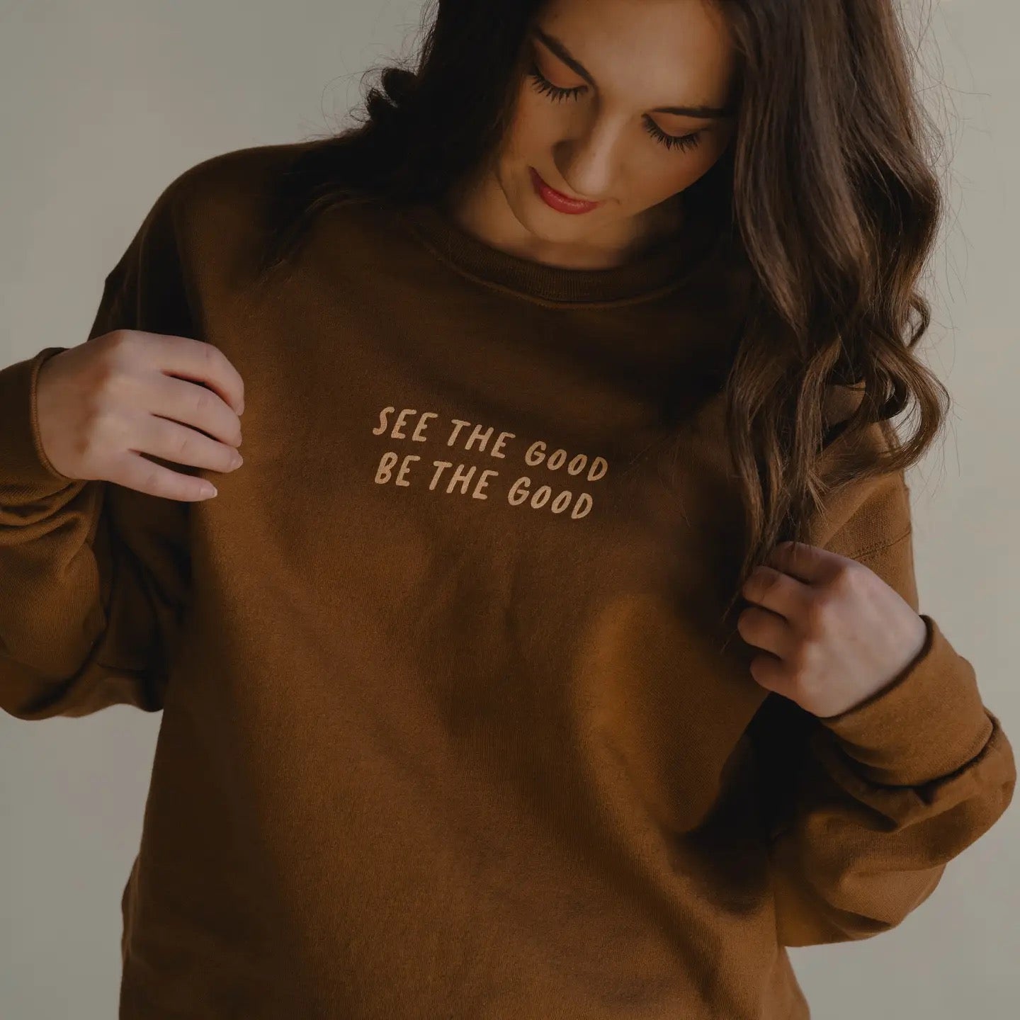 For we are God’s masterpiece. He has created us anew in Christ Jesus, so we can do the good things he planned for us long ago. Ephesians 2:10 See the good, be the good. Golden brown pullover with tan ink. Front + back design. 50/50 cotton/polyester Pre-shrunk Screen printed in Texas