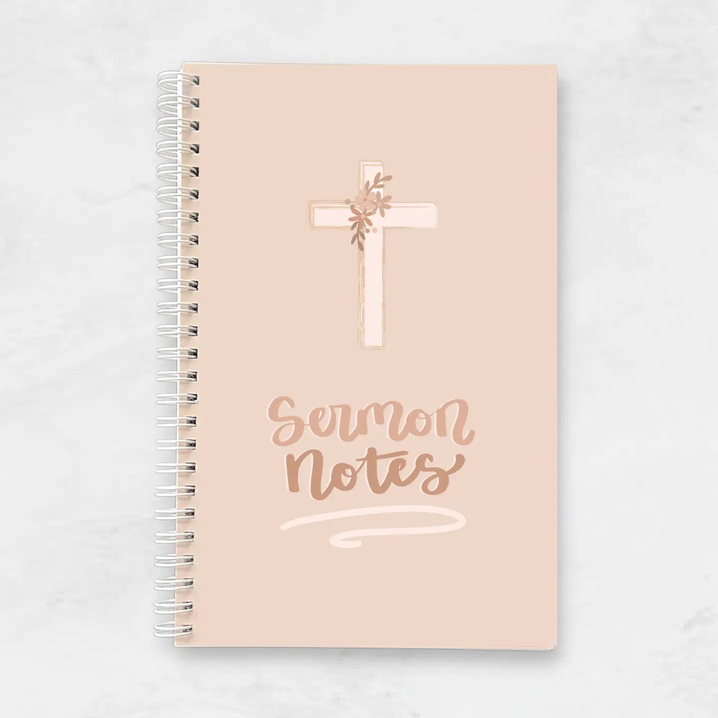 The Sermon Notes Notebook features a durable 8.5" x 5.5" size, ideal for detailed note-taking. Its 12pt cover stock is laminated with a 5 mil gloss finish, providing both sturdiness and a polished look. The white metal spiral binding ensures easy page turning, while the 60 lb smooth interior paper offers a quality writing surface. Inside, college-ruled pages create an organized layout perfect for capturing key points during sermons or study sessions. This notebook balances practicality and durability for focused, reliable use.