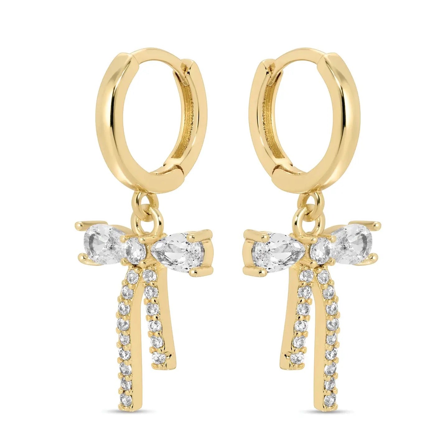 A huggie that's simple in size, but BIG on style, with a dazzling cz bow and pave cz strands! 1" Drop 18k Gold Plated Brass Base Cubic Zirconia