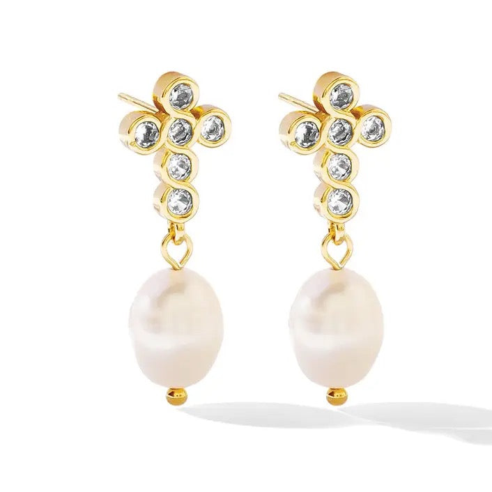 A perfect blend of a cubic zirconia cross stud and a graceful freshwater pearl, creating the perfect balance of radiance and sophistication. A perfect blend of a cubic zirconia cross stud and a graceful freshwater pearl, creating the perfect balance of radiance and sophistication. 1.1" Drop 18k Gold Plated Brass Base Cubic Zirconia Fresh Water Pearl