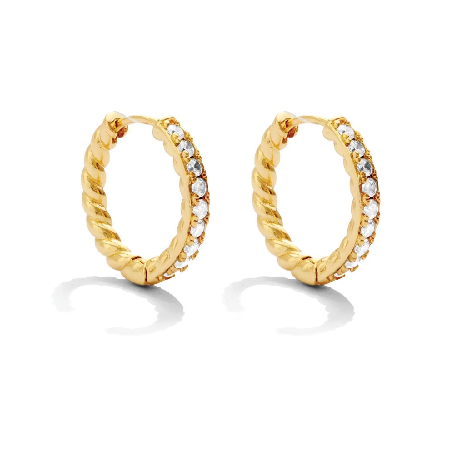 Gorgeous huggies featuring dazzling cz at the front and a trendy twisted vibe at the back - talk about the best of both worlds! .7" Drop 18k Gold or Rhodium Plated Brass Base Cubic Zirconia
