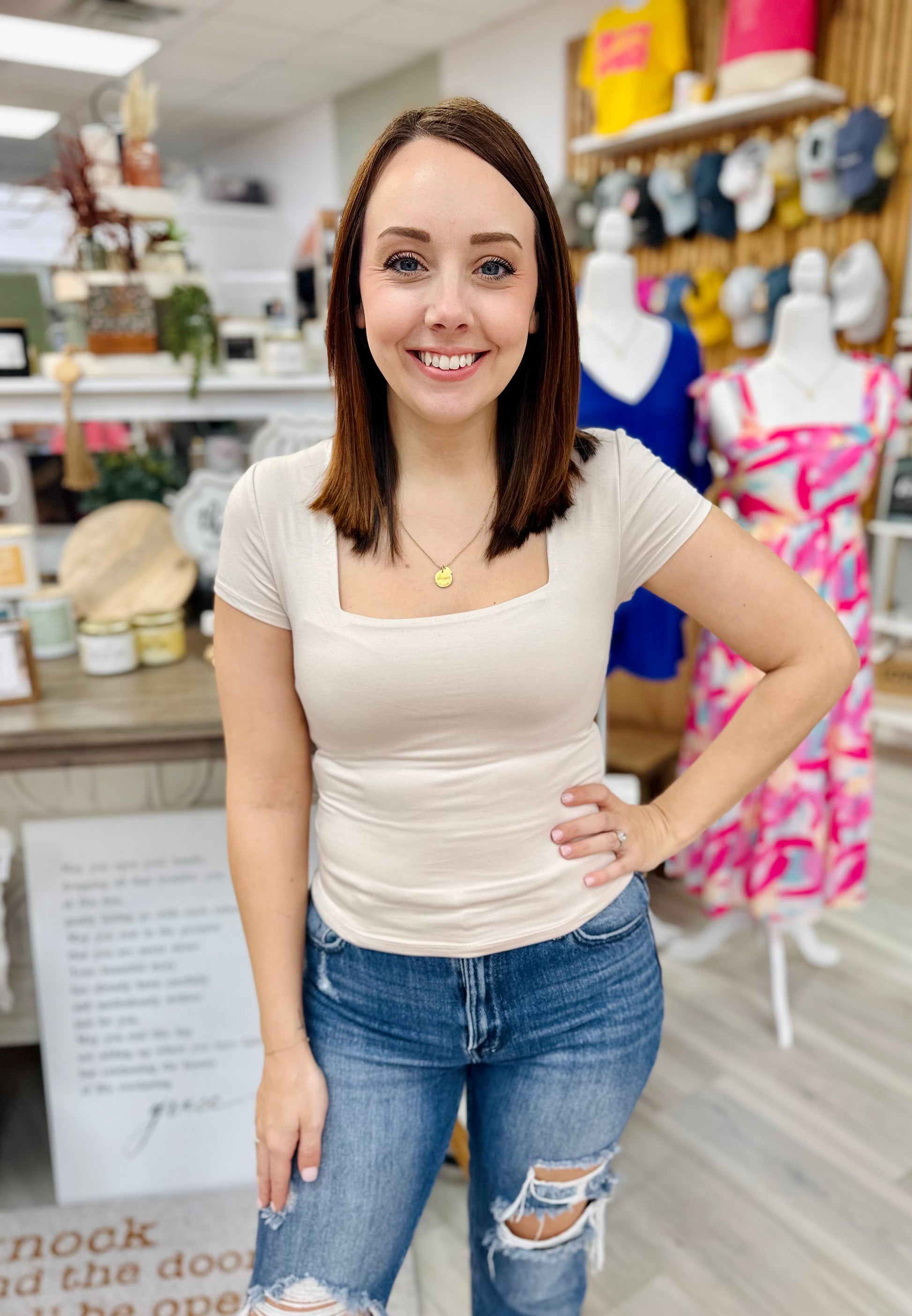 This classic square neck tee is the perfect staple and layering piece for fall through spring. Soft jersey material.
