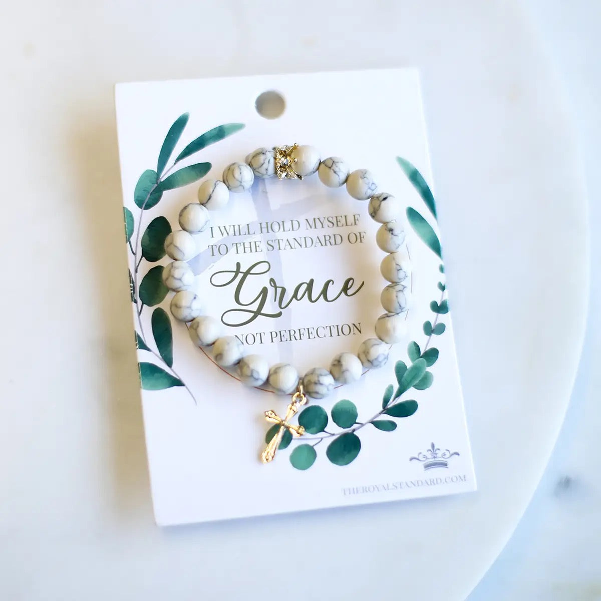 The Standard Of Grace White Marble Bracelet features smooth white marble beads accented by a striking gold crown centerpiece. A delicate gold cross charm hangs gracefully, adding a meaningful touch. At 7 inches, this bracelet complements the Ravenna Stone Earring in White and layers effortlessly with other beaded bracelets for a refined, cohesive look. Perfect for expressing faith with understated elegance.