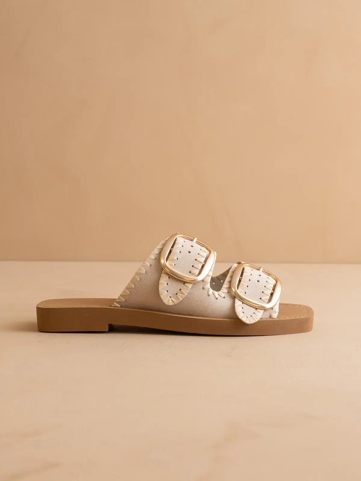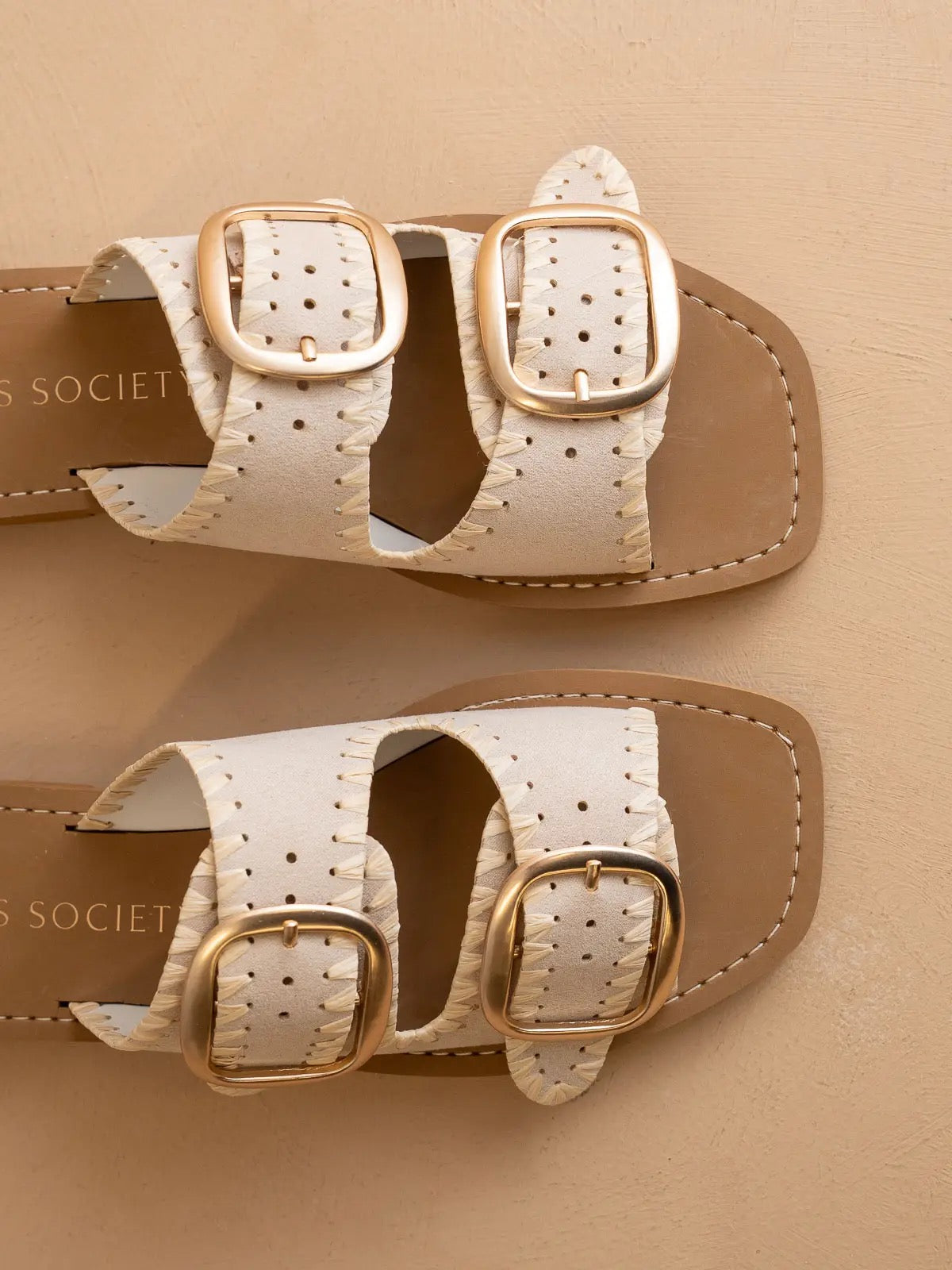 The Tivoli Bone Double Buckle Sandal offers a stylish and comfortable option for casual summer wear. Crafted with a vegan leather upper accented by raffia detailing, it combines durability with a natural aesthetic. The synthetic insole ensures lightweight comfort, while the thermoplastic rubber sole provides reliable traction. Featuring a convenient slip-on design and a modest 0.85" heel, this sandal delivers effortless wearability without sacrificing style. Ideal for warm-weather outings, it balances expert craftsmanship with everyday practicality.