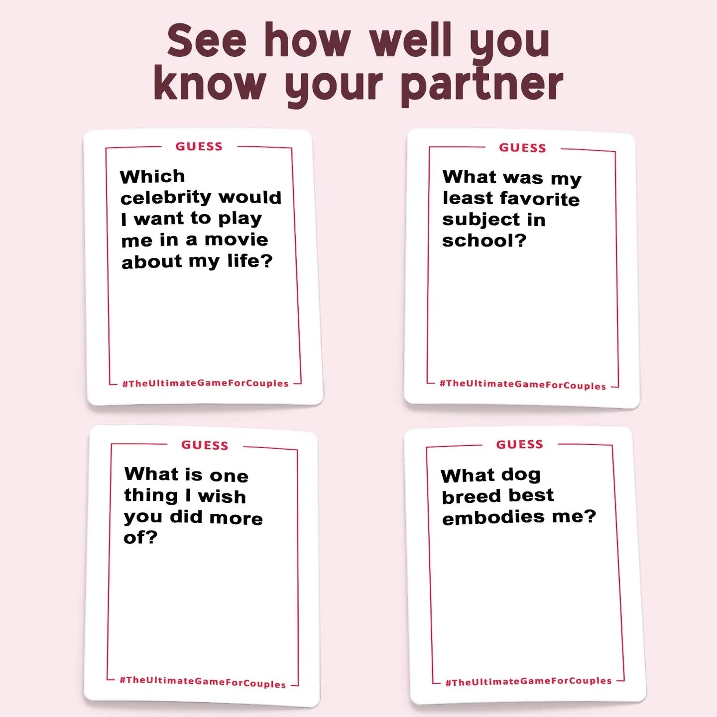 Discover how well you really know each other with this hilarious couples game! Perfect for date night or group gatherings, challenge yourselves and other couples to see who knows their partner best. Answer trivia questions, complete funny dares, and spark meaningful conversations that bring you closer together. With straightforward rules and endless laughs, you'll be ready to play in seconds. Whether it's just the two of you or a friendly competition with friends, this game transforms ordinary evenings into unforgettable memories filled with surprises and connection.
