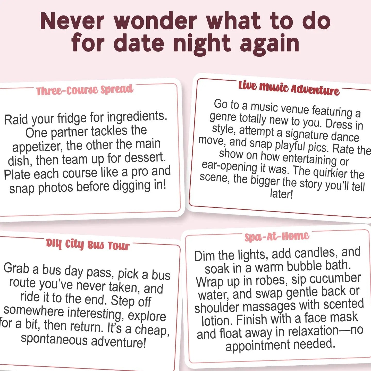 Spice up your evenings with This Is What We Are Doing For Date Night Game—the ultimate way to banish "I don't know, what do you want to do?" from your relationship. Choose from three themed decks packed with creative date ideas, then flip each card to discover the time commitment, budget, and complete plan. Want to keep things unpredictable? Grab a twist card for an exciting surprise that'll have you both laughing and reconnecting. Perfect for couples seeking affordable adventures, cozy nights in, or memorable outings without the planning stress. Every card brings you closer together.