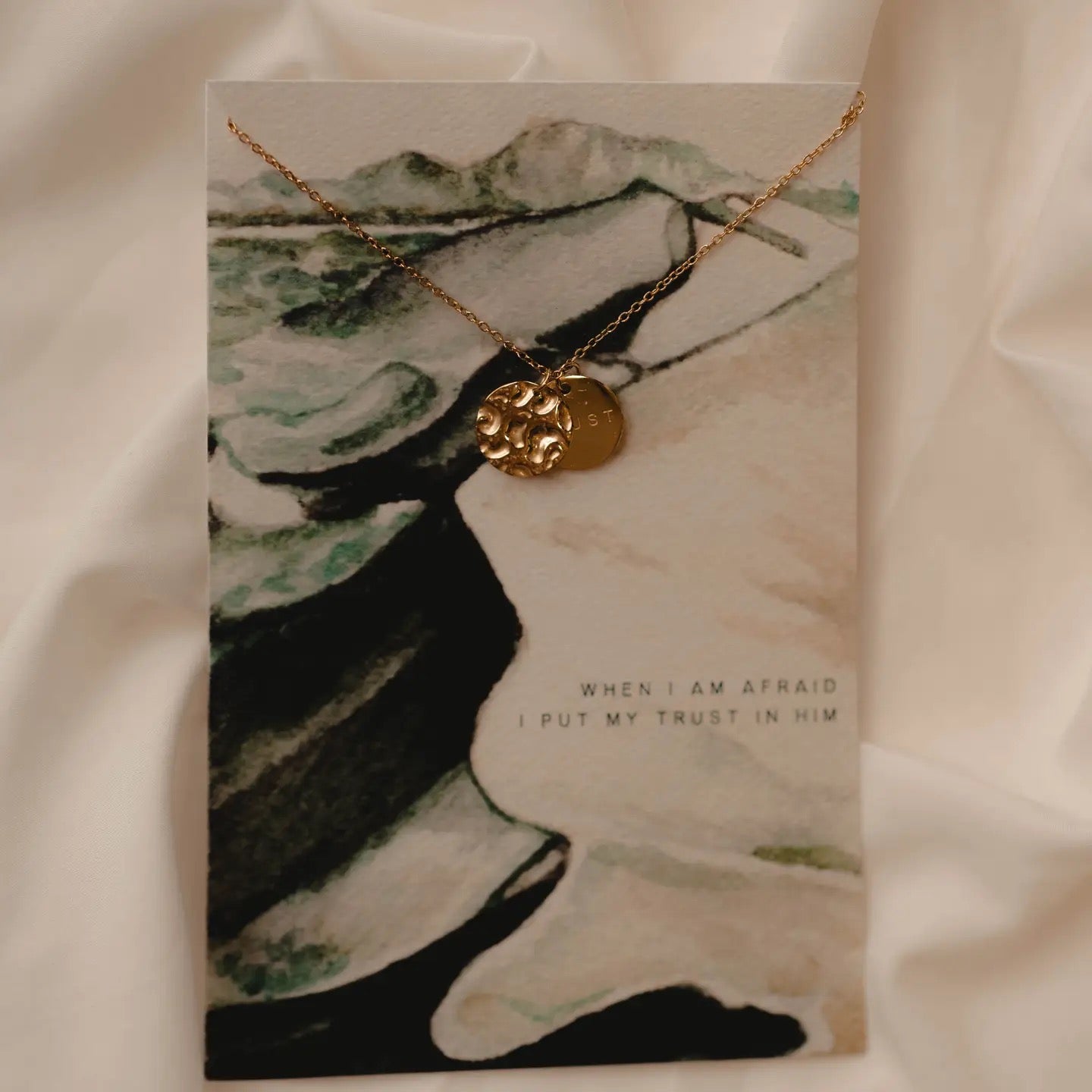 Trusting God Inspired by Exodus 11-14 Walking in uncertainty can be nerve wracking. Reflect upon the Israelites fleeing captivity in Egypt. They had no idea where God was leading them. They heard of this promised land, yet they never saw it with their own eyes. Some of them were uncertain, some of them were scared, some of them begged to return back to slavery due to their lack of trust in God. We sometimes do this in our own walk of faith. When we cannot see what is in front of us, we may be inclined to take a step backward. In those moments, remember that God works all things for His glory and the good of His children.He is a trustworthy God, working to reveal His love for you. Details in the Design:This piece has two discs-one in the front that looks like sand dunes while the smooth disc has the word "TRUST" engraved on it to remind us to trust in God. 18" Adjustable Chain 14kt Gold over stainless steel Tarnish + Water Resistant