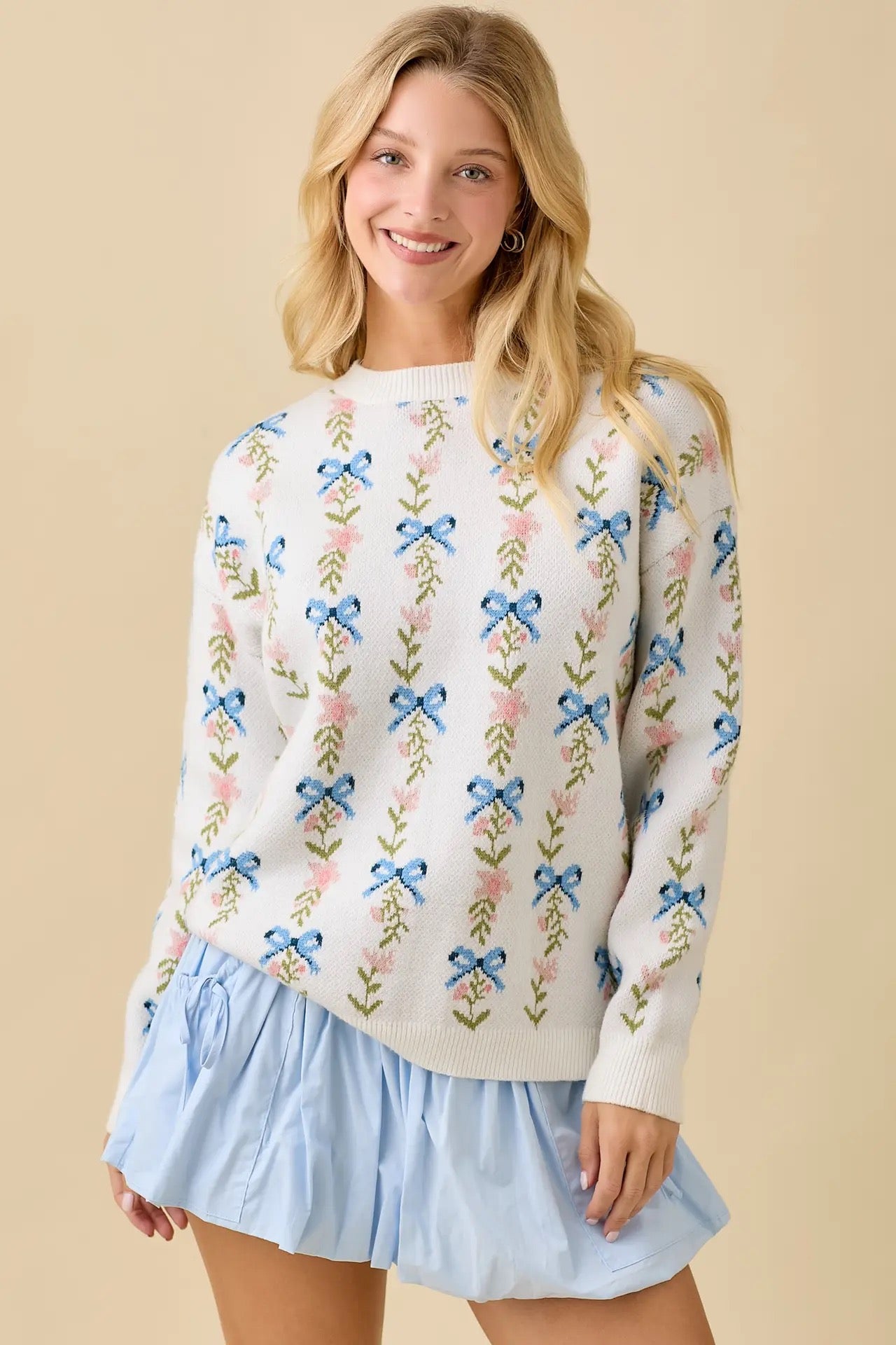 This White Coquette Ribbon Bow Knit Sweater combines delicate floral stripes with a charming ribbon bow detail, crafted from 100% acrylic for a soft, comfortable fit. Its long sleeves and lightweight knit make it ideal for layering in cooler weather, offering both style and warmth with expert craftsmanship. Perfect for adding a feminine touch to your wardrobe while maintaining cozy wearability.
