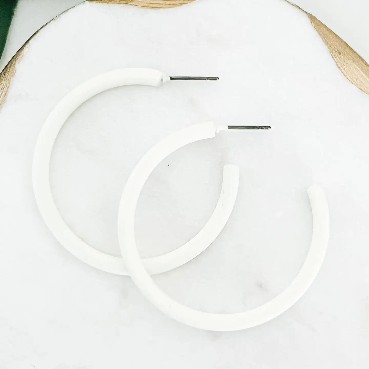 Expertly crafted with a thin rubber coating, these white hoop earrings provide a lightweight option for everyday wear. The lightness of the material ensures comfort and ease, making them perfect for all-day wear without any added weight or strain on your ears.