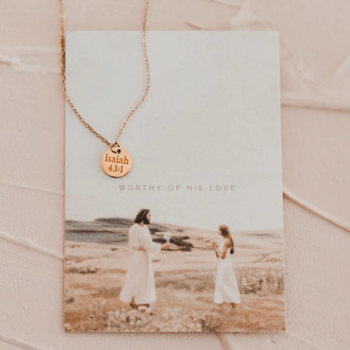 Details: "Worthy" on one side and "Isaiah 43:1" on other 14kt Gold Plated Tarnish + Water Resistant Hypoallergenic 16-18"